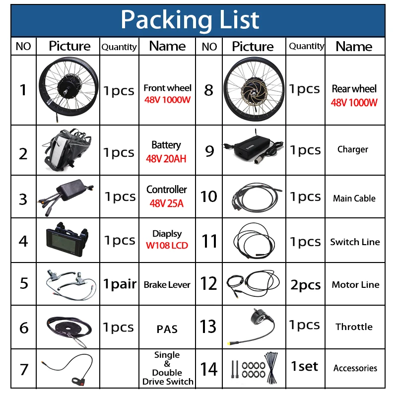 (1) 1 * мотор-колесо 48V 1000W спереди1 * мотор-колесо 48V 1000WРазмер обода: 20/26 "x 4,0(2) 1*48V 20AH литиевая батарея с зарядным устройством(3) 1 * contorller JSD425 (48V 25A)(4) 1 * Дисплей W108 ЖК-дисплей(5) 2 * выключатель тормоза/Датчик тормоза(6) 1 * PAS 12 магнитов(7)1 * дроссельная заслонка (дроссельная заслонка большого пальца или половина закрутки или закрутка дроссельной заслонки)(8) 1 * Одноместный/двухдисковый коммутатор(9)1 * основной кабель(10) 1 * двухмоторная соединительная линия(11) руководство, наклейка, другие аксессуары