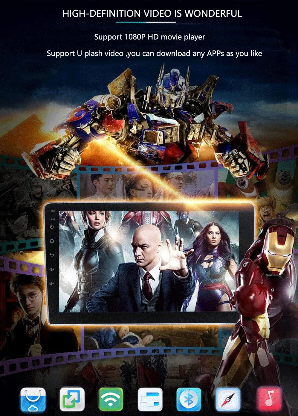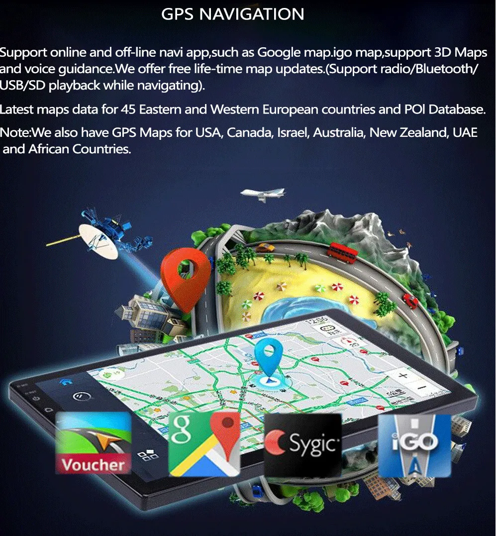 ♦. Высокое разрешение♦. Встроенный Bluetooth для мобильных рук.♦. Встроенная функция GPS♦. Поддержка функции управления рулевым колесом♦. Радиоприемник♦. Видео: MP4,H.264,WMV,AVI,RM/RMVB,VOB и многое другое♦. Аудио: MP3,WMA,WAV и многое другое♦. Встроенная функция Wi-Fi (Используйте точку доступа со смартфона для подключения к Интернету)♦. Встроенное приложение Google Play Store, загрузите приложение, которое вы хотите. 6. Поддержка gps-карты и поддержка онлайн-карты, поддержка Google Map.♦. Порт USB/sd-карты: поддержка воспроизведения MP4,DIVX,JPEG,MP3 и WMA♦. AV выход/вход: 2 видео выхода, 4 аудио выхода, 1 видео вход, 2 аудио входа♦. Выход сабвуфера 4*50 Вт♦. Максимальная мощность: 4X50W Максимальная выходная мощность♦. Язык OSD: английский/русский/французский/немецкий/испанский/итальянский/арабский/Португальский/Турецкий/тайский/Польский/иврит Все 53 языка