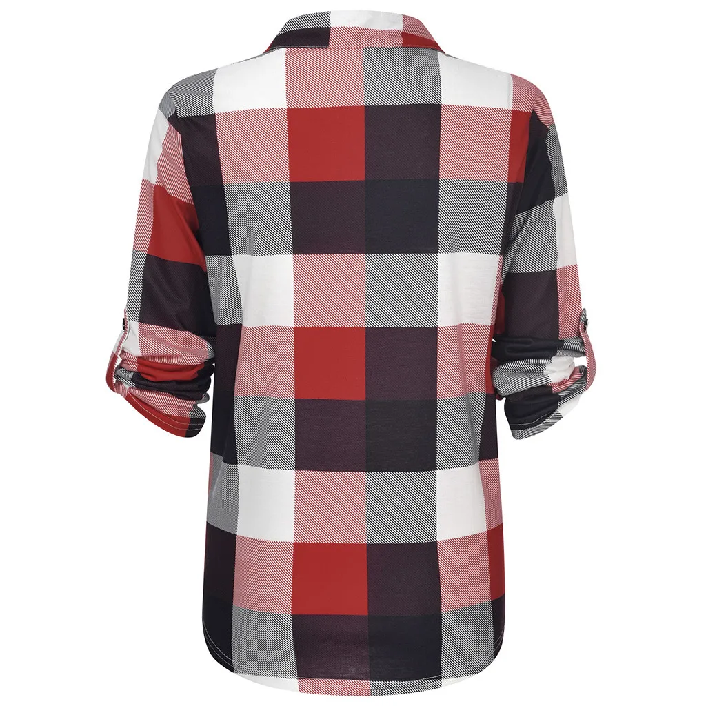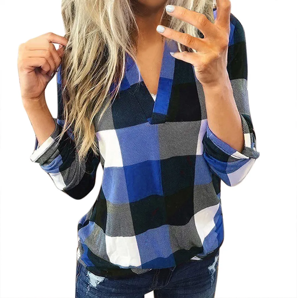Женская рубашка в клетку, с V-образным вырезом и длинным рукавом