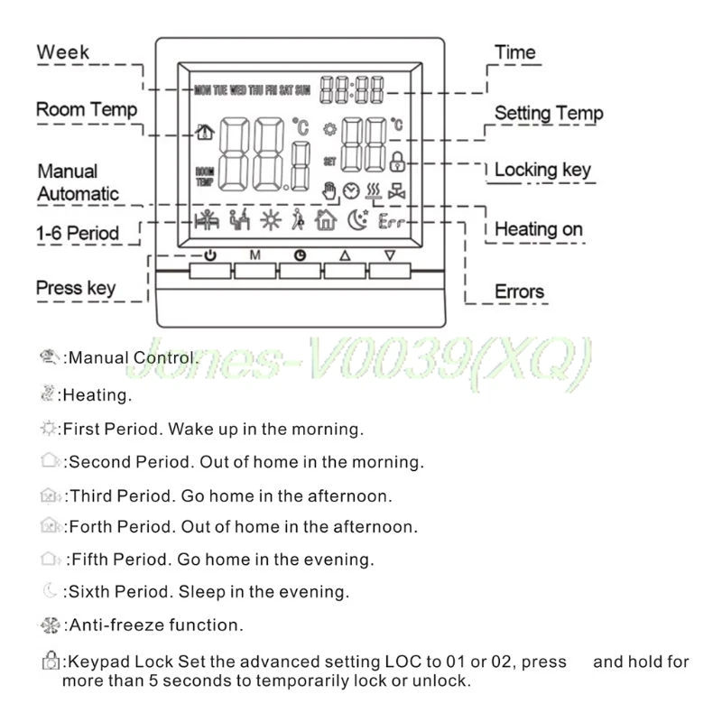 LCD газовый котел термостат 3A Еженедельный программируемый комнатный нагревательный температурный контроллер 86x86 мм ME83L Описание товара Термостат газового котла ME83 оснащен ЖК-цифровым дисплеем. Это с 1,5 в двух секций батарейки типа АА. Он используется для управления котлами для запуска или остановки работы для регулировки температуры. Термостат определяет температуру в помещении, когда фактическая температура в помещении ниже установленной температуры, термостат контролирует бойлер, чтобы начать работу. Затем термостат контролирует бойлер, чтобы остановить работу, когда фактическая температура в помещении выше вашей установленной температуры. Особенности продукта 1) удобно устанавливать на стену или стоять где-то. 2) беспроводное питание, питание от аккумулятора AA, можно разместить в любом месте. 3) может установить 5 + 2 еженедельных программируемых. 4) Блокировка для детей, чтобы избежать неправильной работы. 5) функция антифриза. Характеристики продукта 100% новое состояние 1. Рабочее напряжение: 2x1,5 V AA батарея (не входит в комплект) 2. Потребляемая мощность: <150uW 3. Диапазон контроля температуры: 5 ~ 99 ℃, (заводская установка 5 ~ 35 ℃) 4. Диапазон температур: 5 ~ 99 ℃ 5. Точность контроля температуры: ± 1 ℃ 6. Размер: 85x85x28 мм 7. Датчик температуры: Встроенный Посылка включает в себя: 1 х газовый котел термостат 2 крепежных винта 1 x Инструкция на английском языке