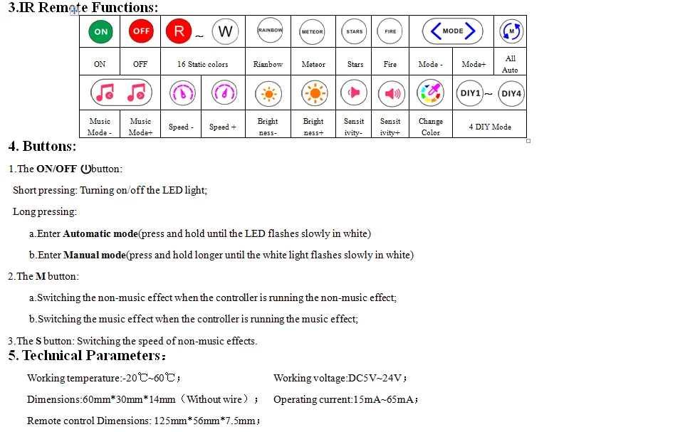 Параметры продукта 1. Рабочее напряжение: DC5-24V 2. Диапазон регулировки: 15-20 м 3. Метод управления: ИК-пульт дистанционного управления + управление приложением 4. Максимальный ток нагрузки: 6A 5. Управляемые точки: 900 точек 6. Рабочая температура:-20-60C 7. Выход: Одна Головка и двойная головка (опционально) Особенности 1. Поддержка WS2812, WS2811, 1903, 16703 и других волшебных огней 2. 3 способа управления: ИК-инфракрасный 38 клавиш, 3 кнопки на контроллере, приложение для смартфона 3. С функцией синхронизации 4. Поддержка изменения имени устройства и калибровки последовательности каналов RGB 5. Встроенный 180 видов динамических эффектов, регулируемая скорость, яркость, автоматическая петля, встроенный 8 музыкальных режимов, регулируемая чувствительность 6. Поддержка голосовых команд для прямого вызова 8 статических сцен с цветовым эффектом, 8 сцен с динамическим эффектом и 8 сцен с музыкальным эффектом 7. Поддержка Amazon Alexa, Google Assistant, Tmall Genie и других голосовых помощников для управления световым эффектом, яркостью и цветом 8. С функцией памяти отключения питания, источник питания имеет функцию анти-обратного подключения