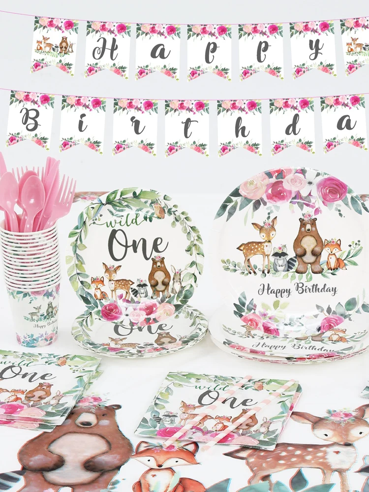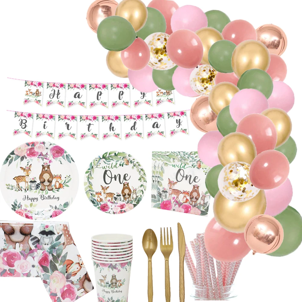 Розовый дикий один день рождения воздушные шары джунгли для вечеринки в стиле сафари украшение животных для девочек первый день рождения партии посуда поставки