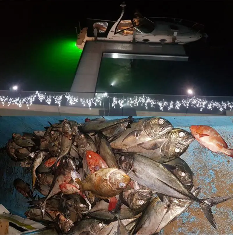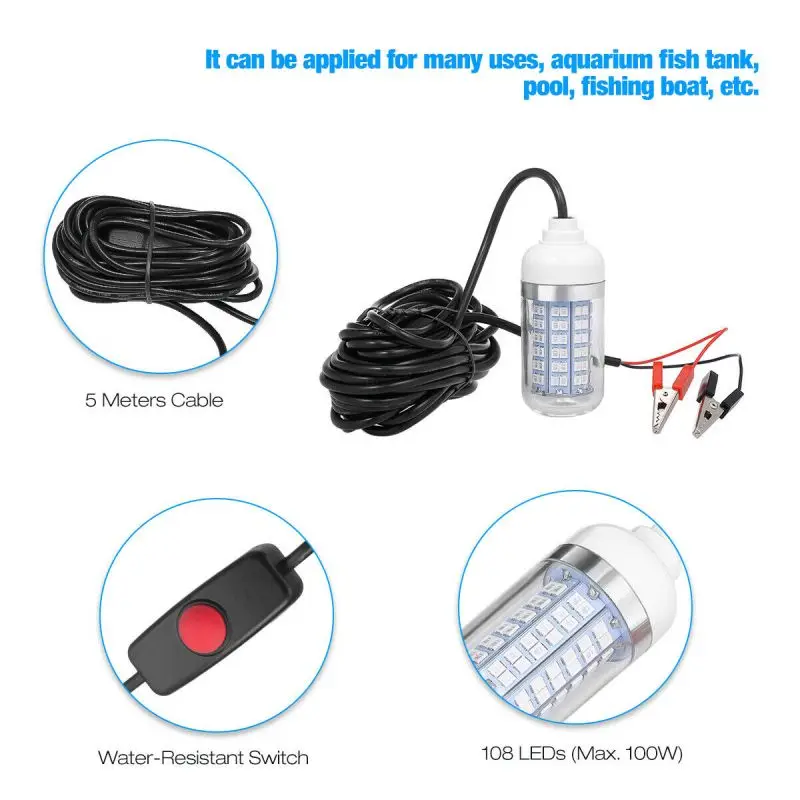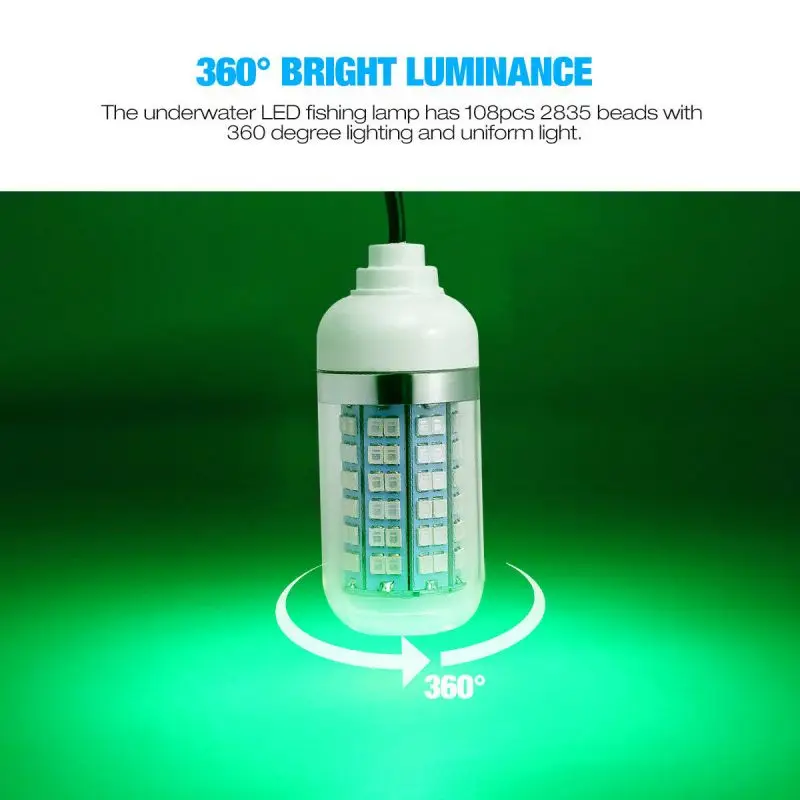 Вид на 360 градусов: подводный светодиодный светильник для рыбалки имеет 108 шт. 2835 бусин. Это супер яркий для ночного использования, который является ультра-низким потреблением батареи. Это 360