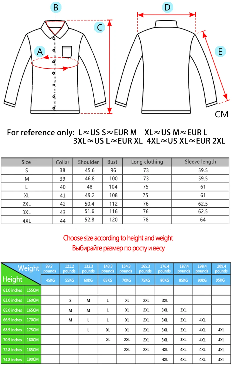 A: обхват груди B: воротник C: длина D: плечо E: рукав