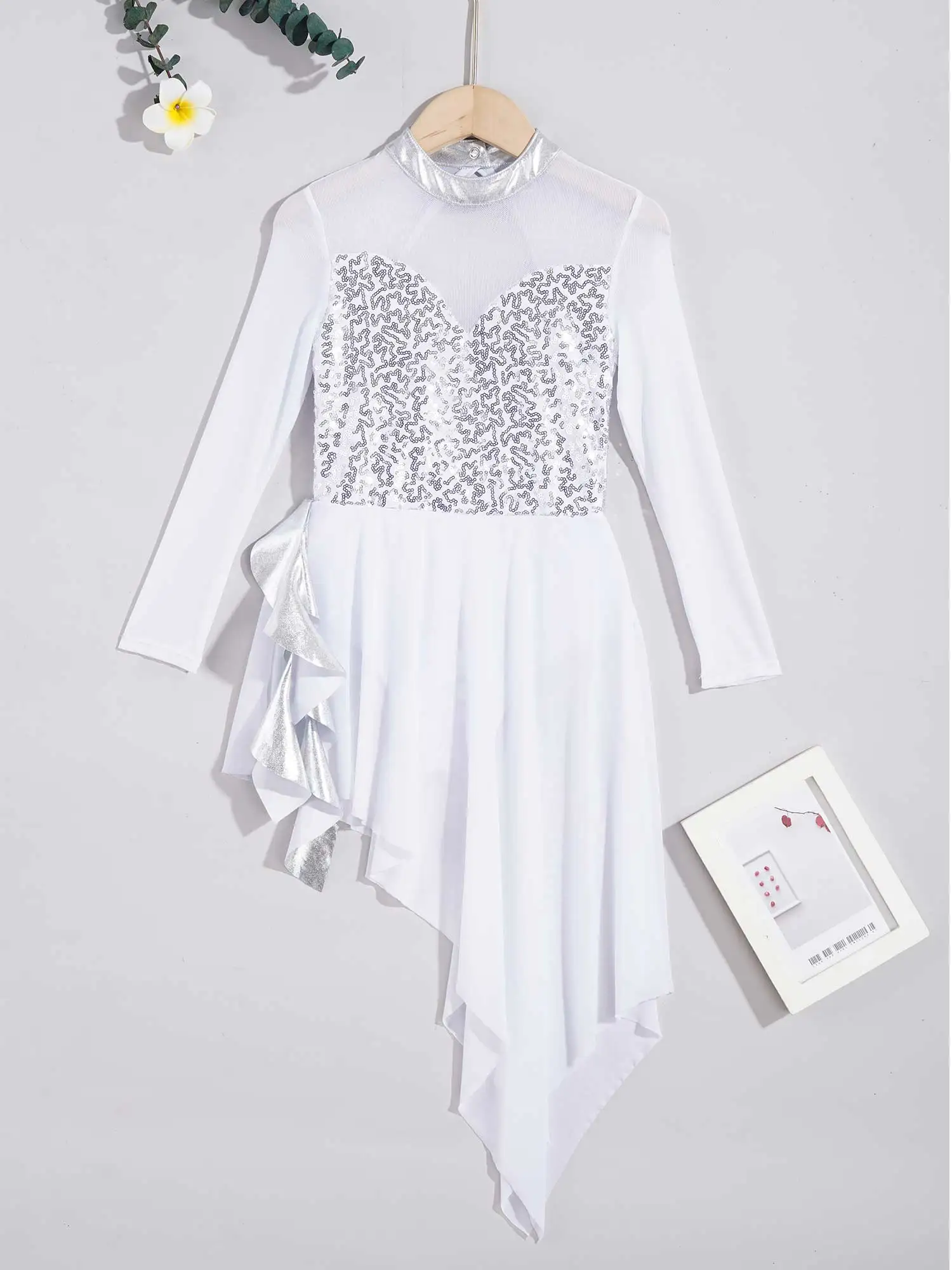 Платье с длинными рукавами, круглым воротником, открытой спиной, асимметричным подолом, украшенным блестками.