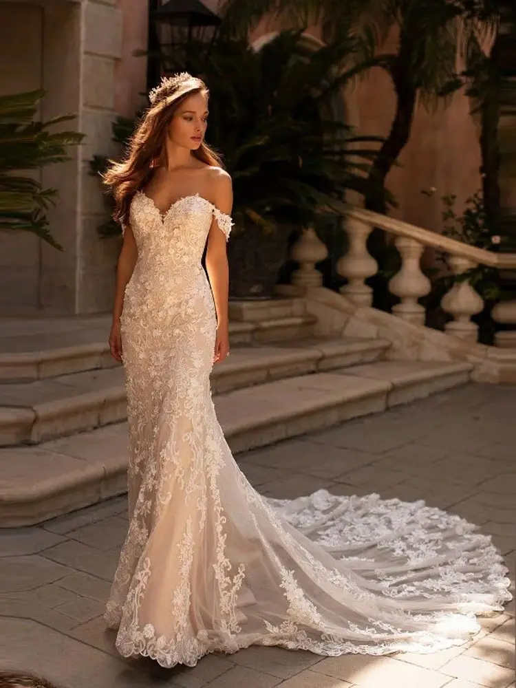 Женское свадебное платье с открытыми плечами, элегантное платье с открытой спиной и шлейфом, лето 2021