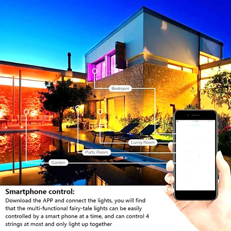 Управление смартфоном: Загрузите приложение для контроллера Bluetooth (подходит для IOS и Android) и Подключите Свет через Bluetooth, вы обнаружите, что многофункциональные сказочные огни могут легко управляться смартфоном за раз, и можно управлять 4 струнами, можно только зажечь вместе