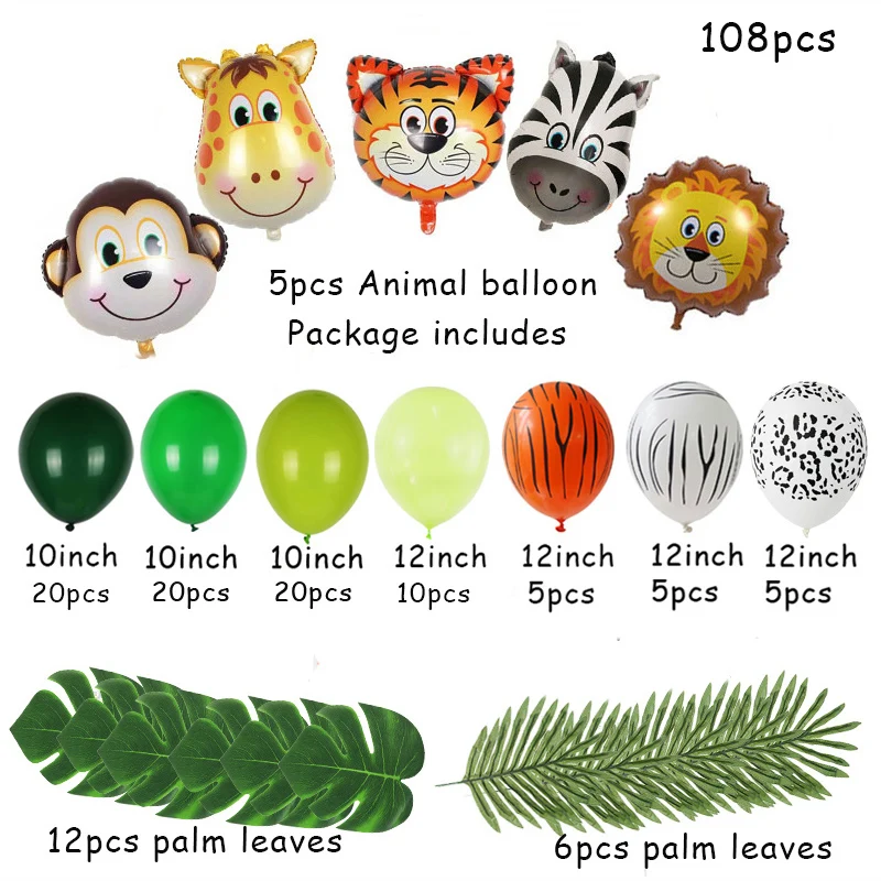 Материал: латекс, фольга и пластикРазмер латексных шаров: 10 или 12 дюймовВоздушные шарики в виде животных размер: как показано на картинкеПосылка: 109 шт./компл. (85 шт. латексных шаров + 5 шт. воздушных шаров для животных + 12 шт. пальмовых листьев + 6 шт. в форме листьев + 1 шт. 5 м цепочка для воздушных шаров)