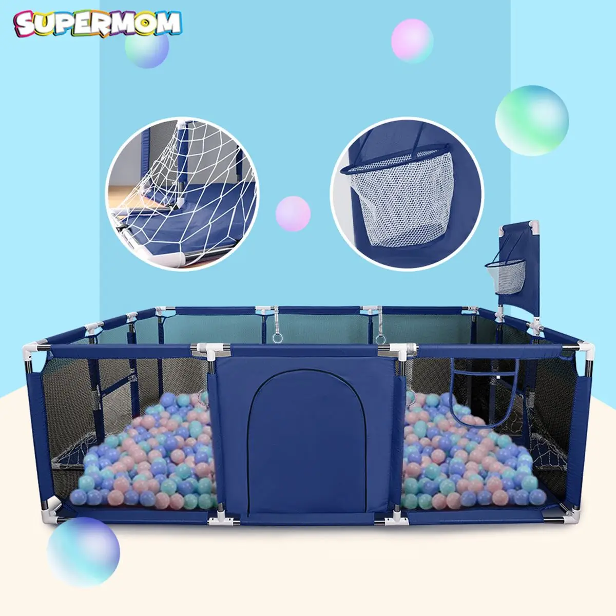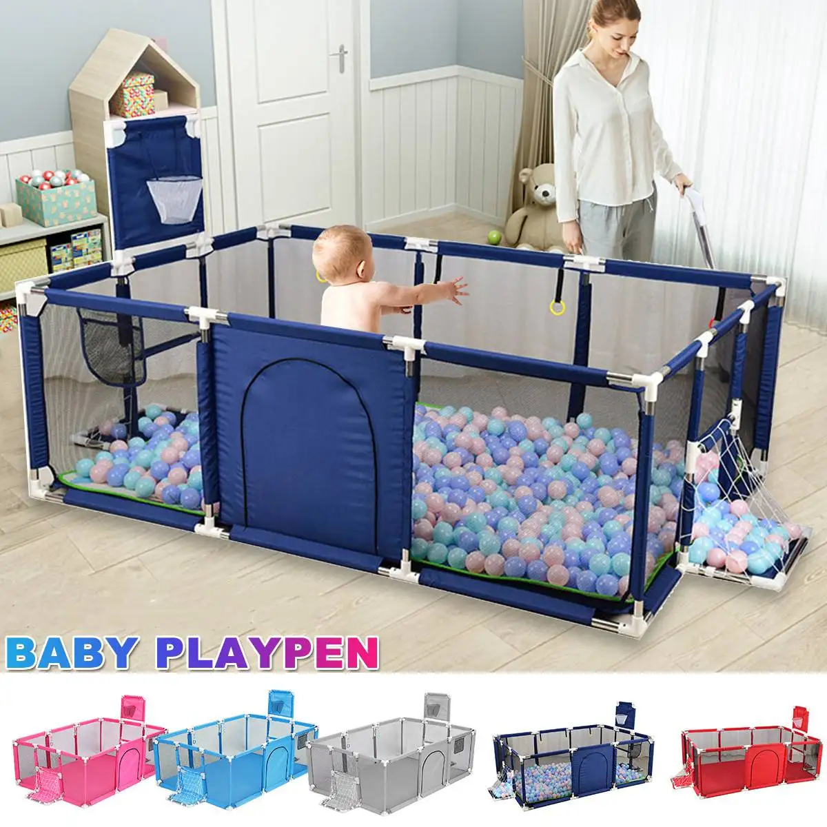 Детский манеж Интерактивная детская игровая площадка океан мяч ворота безопасностиХарактеристики:Название продукта: детский манежС/без корзины: сМатериал: ABS пластиковые разъемы, трубка из нержавеющей стали, ткань из полиэстера ОксфордЦвет: красный, синий, серый, небесно-голубой, розовыйРазмеры: 181*122*61 см/71,25*48,03*24,01"Размер посылка: 64*17*23 см/25,19x6,69x9,05 "(appr.)Особенности:● Тканевый манеж легко собирается. Он обеспечивает хорошее пространство для вашего малыша, но его легко разместить в любом месте вашего дома. Это отличный способ дать вашему ребенку свободу передвигаться, но убедитесь, что они находятся в безопасном месте.● Он поставляется с вентиляционными сетчатыми стенками для легкой видимости и открывающейся на молнии дверью, что обеспечивает легкий доступ. Его легко поддерживать. Вы можете протереть его или удалить ткань и поместить в стирку.● Он будет доставлен вам безопасно в хорошо упакованной коробке, чтобы обеспечить лучшее качество.● Подходящий возраст: предназначен для детей до 36 месяцев