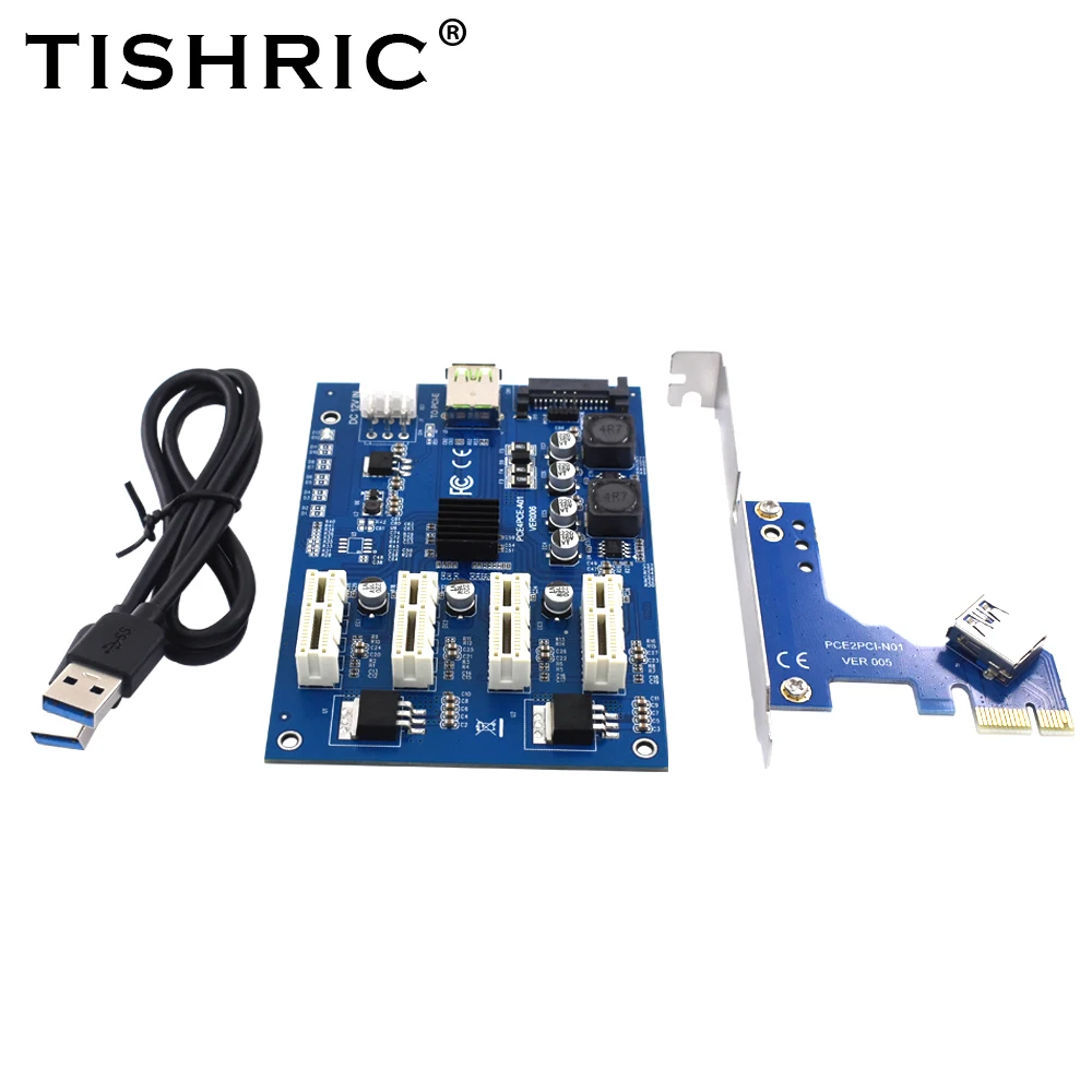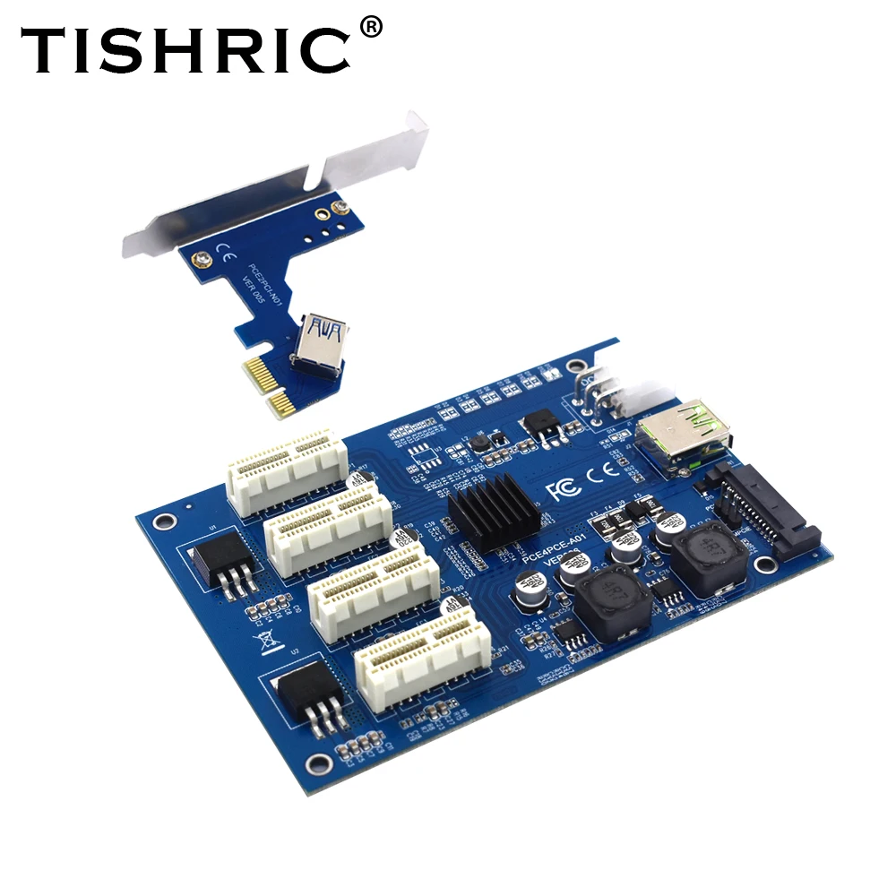 TISHRIC PCIE 1X до 4-Порты и разъёмы 1X видеокарта Riser USB3.0 срочной расширяющийся SATA (15 контактов + 6pin Питание Порты и разъёмы с ASMedia чип