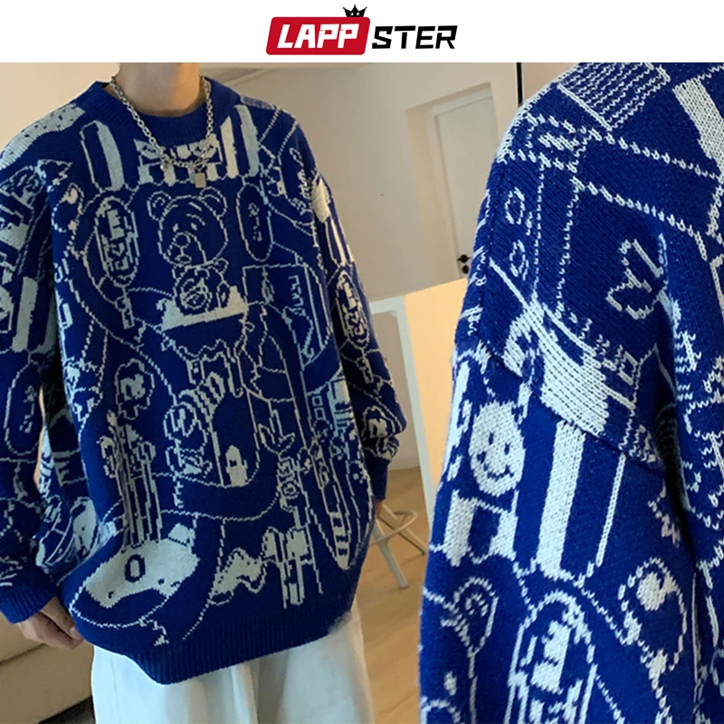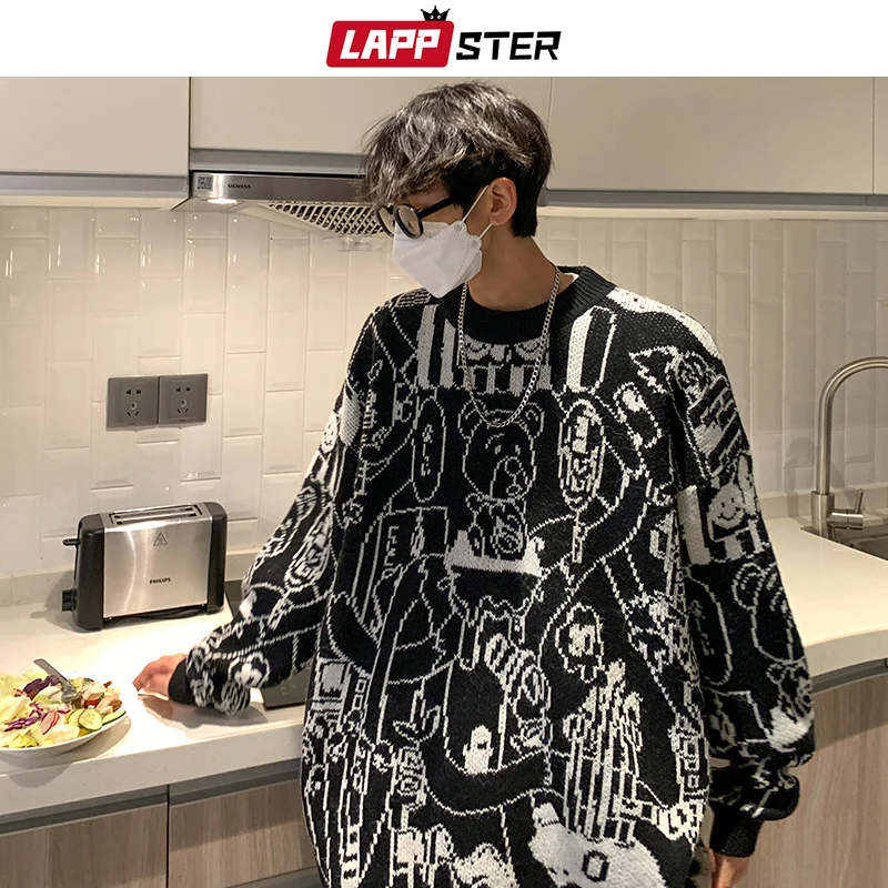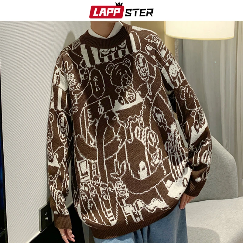 Мужские винтажные милые свитера LAPPSTER в стиле харадзюку 2022, мужские корейские модные мультяшные пуловеры, мужской милый свитер оверсайз с медведем, одежда