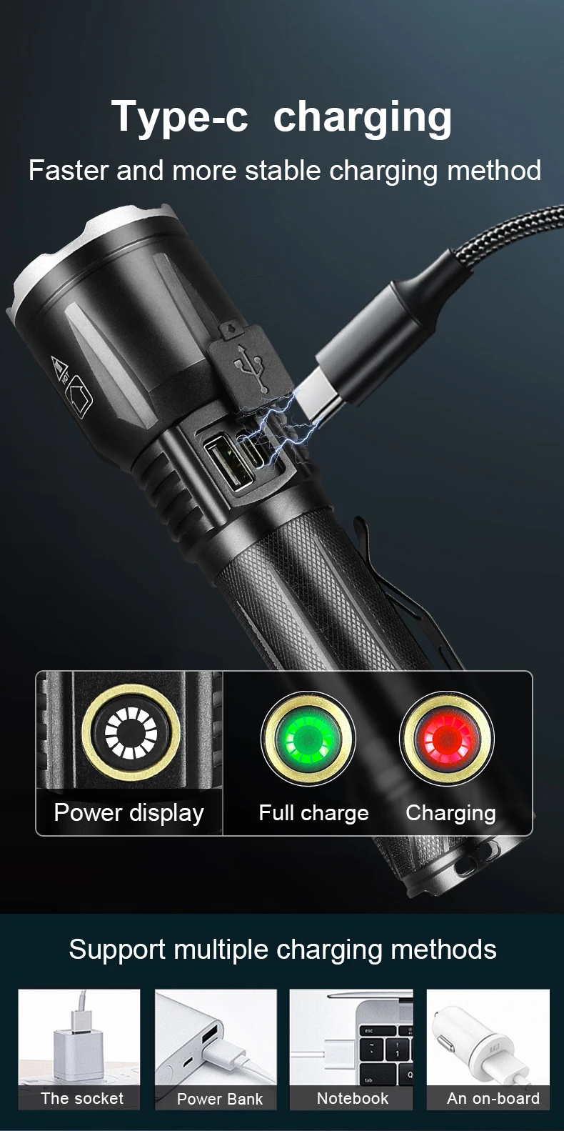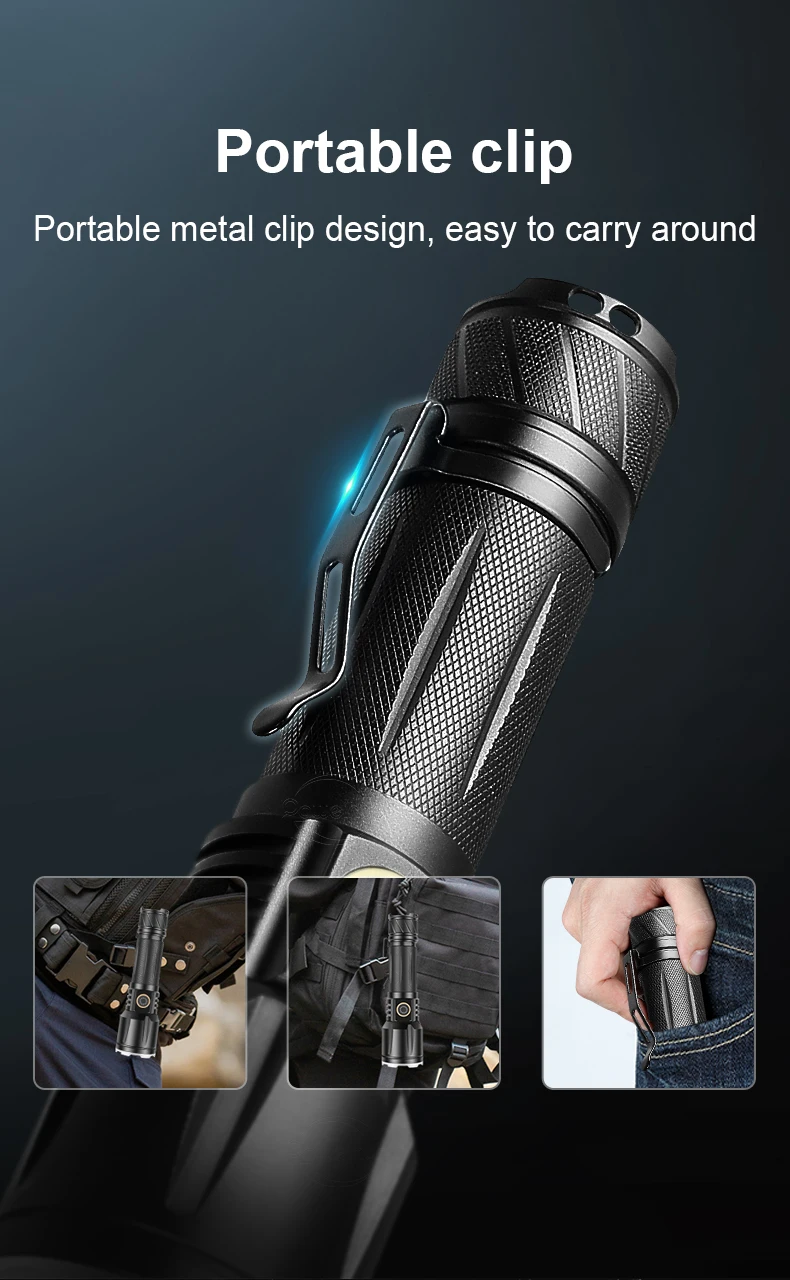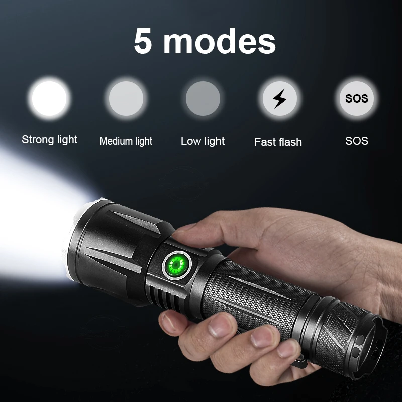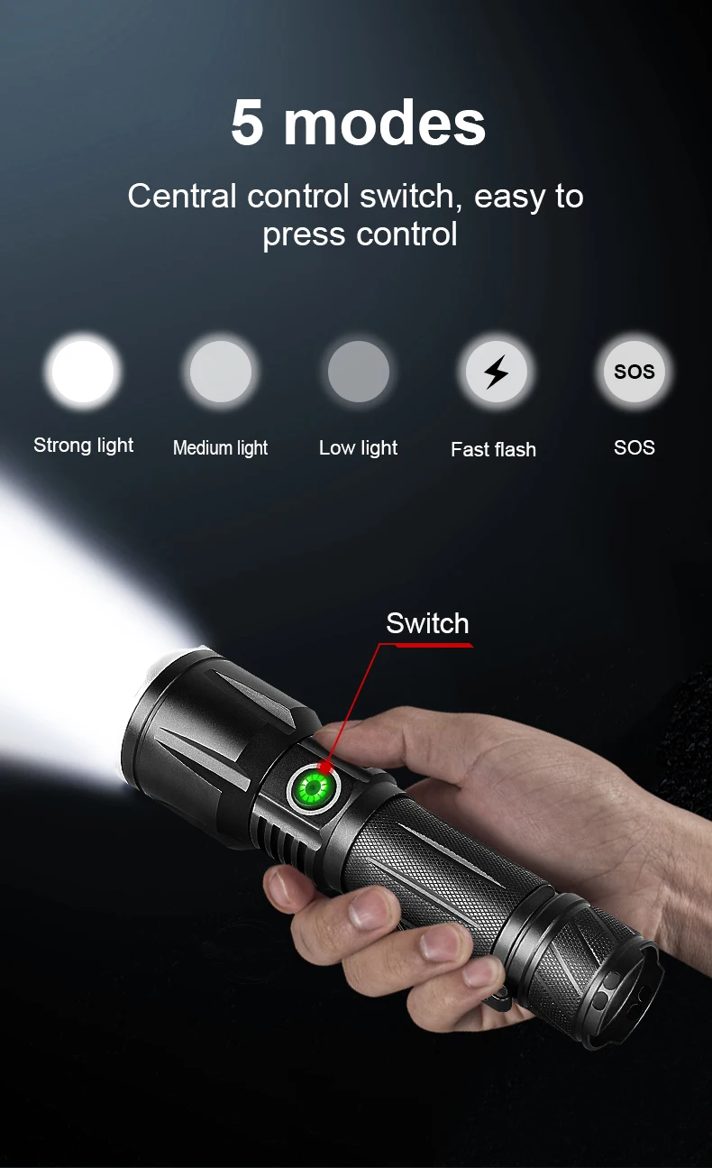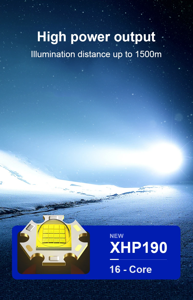 Десять причин для выбора XHP190:1. Используя новейший светодиодный фитиль XHP190, максимальная мощность может достигать 130000 люменов. Расстояние облучения выше 1500 м.2,5 режимы, вы можете свободно выбирать светильник интенсивностью и поможет режим в соответствии с потребностями сцены.3. Телескопическая функция фокусировки, точечный луч и луч потока. Произвольно Отрегулируйте Эффект луча путем растяжения.4. Совершенно новый модернизированный аккумулятор (18650/26650), срок службы батареи 6-15 часов.5. С индикатором низкого заряда батареи, он может быть заряжен вовремя, чтобы предотвратить фонарик от внезапной остановки работы.6. Есть зажим для ручки на хвосте, который можно непосредственно закрепить в карманах, рюкзаках, велосипедах и т. Д. После использования. Освободите руки и легко носить с собой.7. Не нужно использовать старомодное Универсальное зарядное устройство, Type-cUSB зарядка, удобно и быстро, поддерживает вход и выход, и может заряжать мобильные телефоны.8. Водонепроницаемость IPX6, может использоваться в экстремальных погодных условиях, но не может погружаться в воду.9. Светильник-вспышка излучает белый светильник, который соответствует визуальному опыту людей, поэтому вам не нужно тратить время, чтобы привыкнуть к нему ночью. Это обязательный продукт для друзей, которым нравится активный отдых на свежем воздухе.10. Он изготовлен из авиационного алюминиевого сплава, а поверхность спроектирована с противоскользящими линиями, противоскользящими и износостойкими и используется для самозащиты при необходимости.