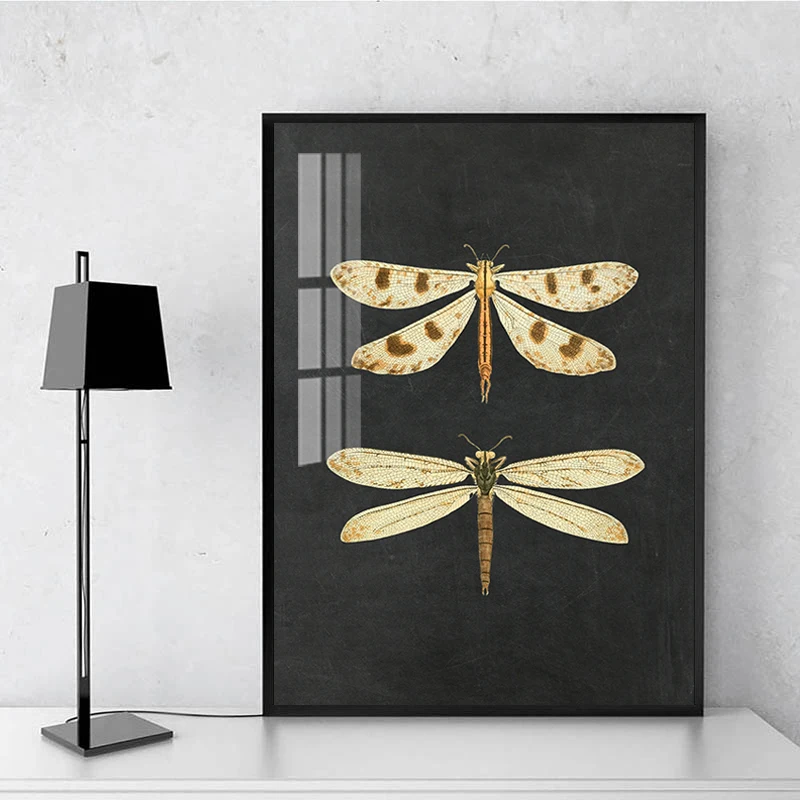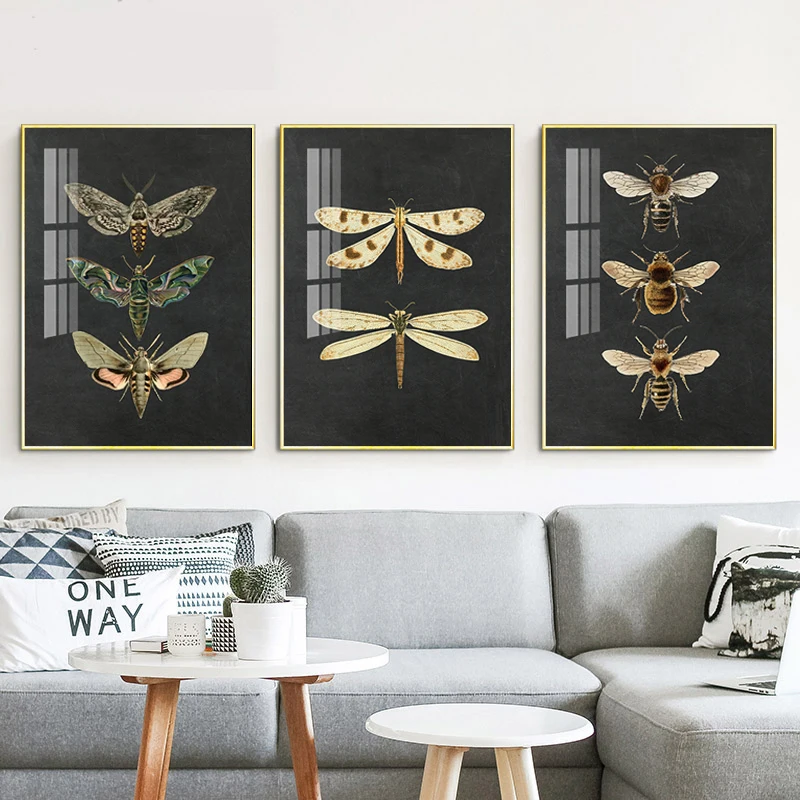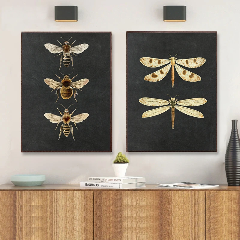 Картина на холсте с черными насекомыми, настенный постер в скандинавском стиле с изображением бабочки, стрекозы, пчелы, Современное украшение для гостиной