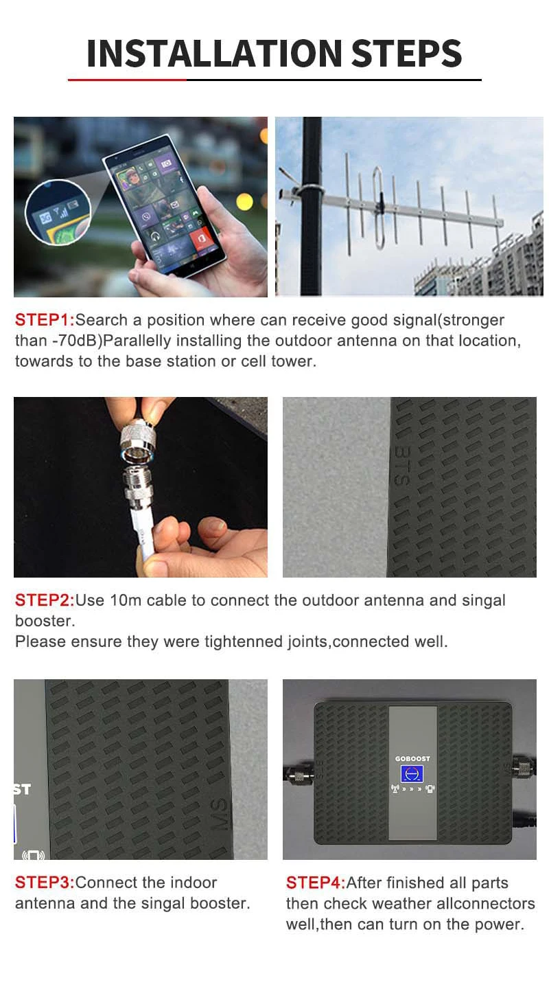 1. Зафиксируйте прием наружной антенны крыши или высокого места и точки поворота.2. Подключите внешнюю антенну к ретранслятору «BTS» порт через кабель.3. Подключите внутреннюю антенну к ретранслятору "мобильному" порту.4. Шнур питания переменного тока в источник питания и закончен.5. Совет: наружная антенна должна быть "изолирована" от внутренней антенны, то есть должна быть конструктивные препятствия (стены, перегородки и т. Д.) между антеннами.