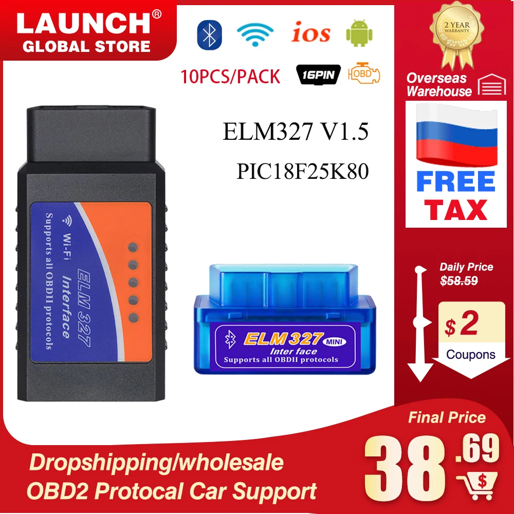 Автомобильный диагностический инструмент OBD2 ELM 327 OBDII OBD2 v1.5, устройство считывания, работает на Android IOS Pic18f25k80, 10 шт.