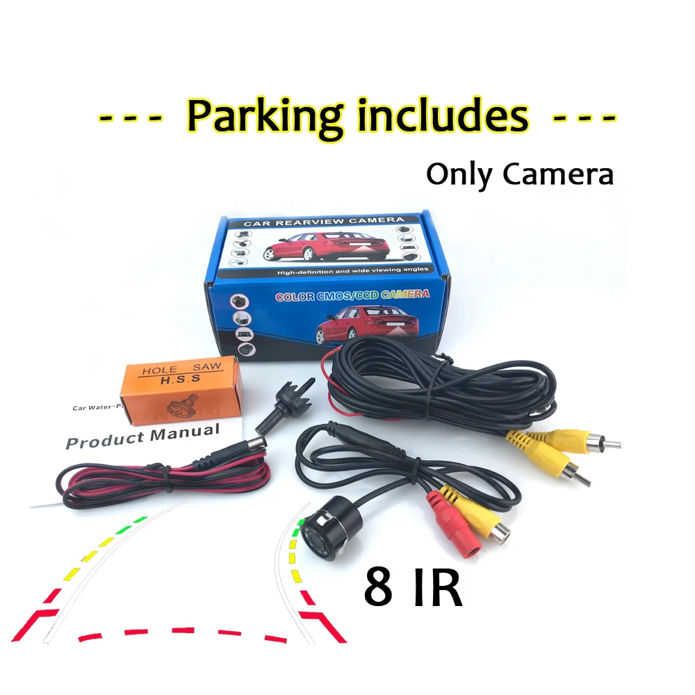 Параметры* Автомобильная интеллектуальная динамическая траектория треков линии парковки. Подходит для Android DVD Универсальный TFT ЖК-монитор автомобиля.* Не нужен блок пути, не нужен интерфейс CANBUS или OBD, встроенный модуль треков заднего хода.* Импортные чипы CCD Реверсивный трек, четкость изображения, стабильность, хороший эффект ночного видения.* Импортные 150 супер широкоугольный объектив, водонепроницаемый, пыленепроницаемый, анти-туман, ударопрочный.* Широкий угол, технология распознавания изображений, точная траектория заднего хода, первая ведущая технология.1. Пиксели: 728 (В) * 492 (В)2. Мощность: 12 В постоянного тока3. Угол обзора: 170 градусов4. Датчик изображения: ccd-камера5. ТВ система: NTSC ( PAL опционально).6. Горизонтальное разрешение: 520 ТВ-линий7. Синхронизация. Система: внутренняя8. Отношение S/N: >48 дБ9. Электронный затвор: от 1/60 до 1/100 000 секунд10. Видеовыход: 1.0Vpp, 75Ohm11. Баланс белого: Авто12. Водонепроницаемость: IP6813. Длина видеокабеля: около 6 м