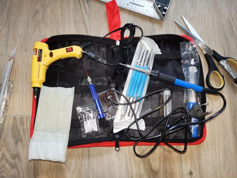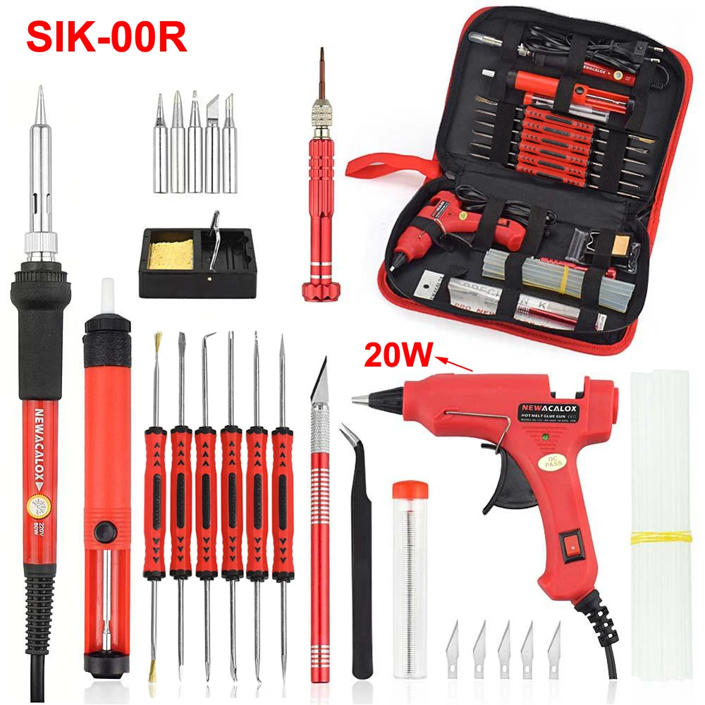 Посылка включает в себя:1 х нож для резьбы (14 см)5 запасных лезвий1 отвертка (содержит 4 запасных головки отвертки)10 x штук D7 * 100 мм Клей-карандаш5 запасных наконечников паяльникаКлеевой пистолет 1 шт. (100V-240V, 20 Вт, штепсельная вилка европейского стандарта)1 x y-образный паяльник1 x Оловянная проволока (Diameter-1mm, 10 г)1 х насос для демонтажа6 шт. паяльный инструмент1 пинцет1 x паяльник с регулировкой температуры (220 В, 60 Вт, штепсельная вилка европейского стандарта/110 В, 60 Вт, вилка стандарта США)1 нейлоновая сумка