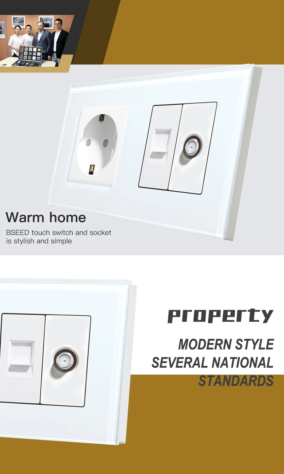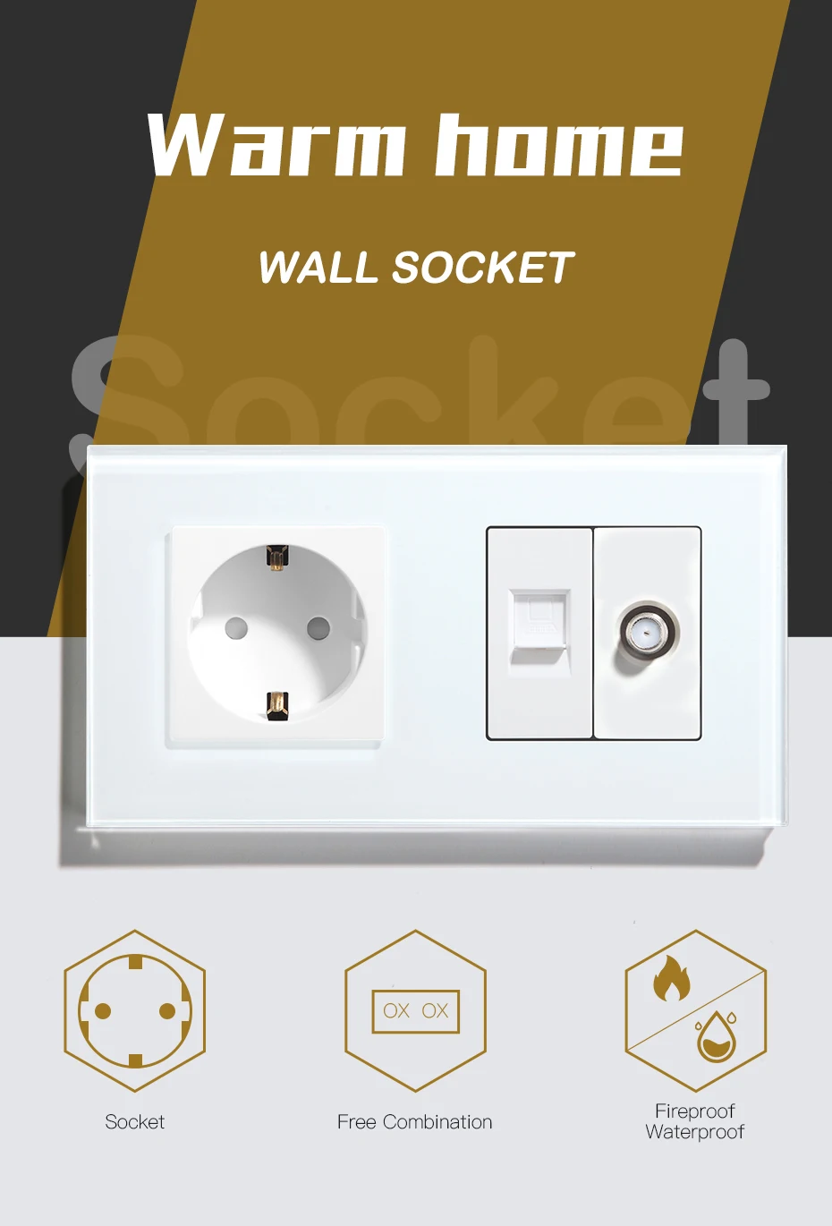 BSEED настенная розетка ТВ спутниковая со стандартом ЕС электрические вилки розетки Хрустальная стеклянная панель белый 3 цвета розетки