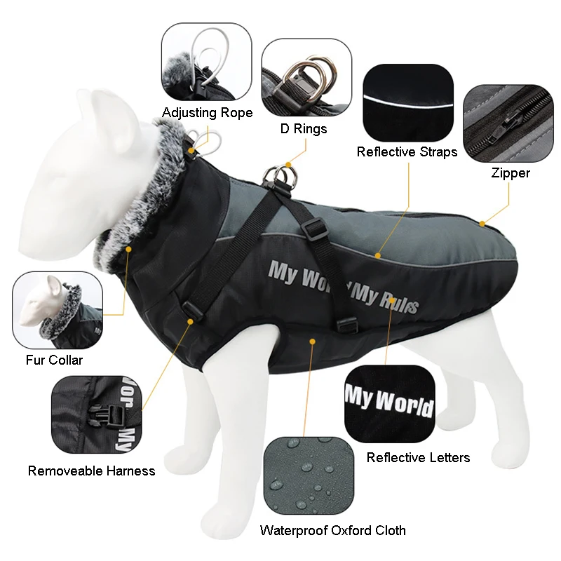 Простой и модный внешний вид: теплое пальто для собаки стильное и простое по внешнему виду. Толстый и мягкий пушистый воротник можно поворачивать вверх и вниз, различные стили для ношения. Дизайн с завязками на шее и талии можно регулировать в соответствии с размером собаки. «Мой Мир мои правила» не только показывают вашу индивидуальность, но и отражает светильник ночью, чтобы обеспечить безопасность вашей собаки.