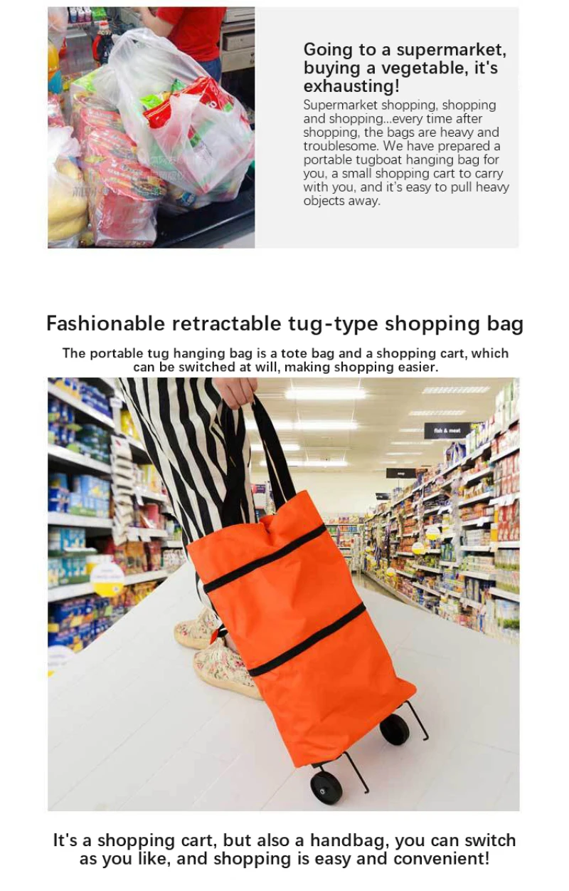 Поход в супермаркет и покупка еды утомляет! Выберите крючки в супермаркете и отправляйтесь за покупками. Каждый раз после покупки большие и маленькие сумки такие тяжелые и хлопотные. Мы подготовили портативную подвесную сумку для буксира для вас, небольшую тележку для покупок, которую вы носите с собой, и легко вытянуть тяжелые предметы.