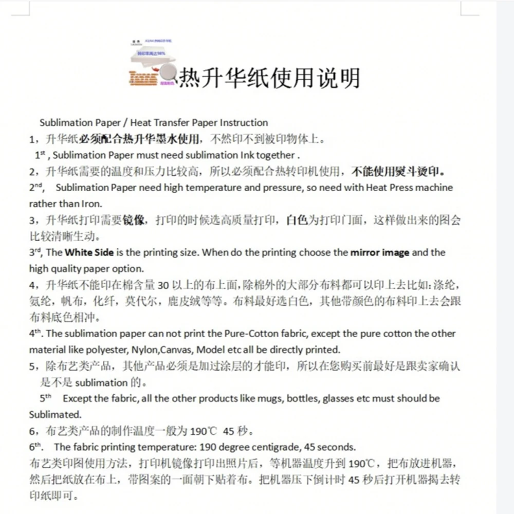 Примечание: 1. Сублимационная бумага должна использоваться с сублимационными чернилами, в противном случае она не будет напечатана на печатном объекте.