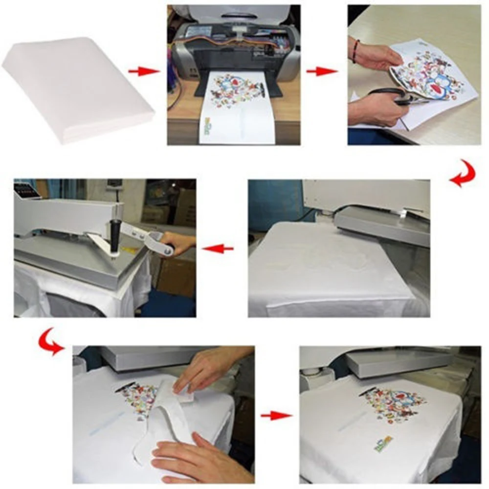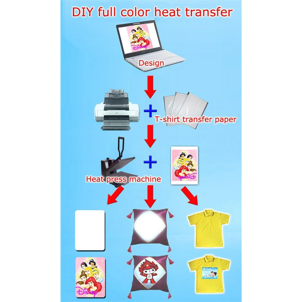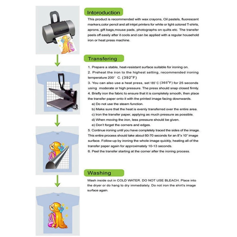 How to use:printing patterns on a sticky side. After the pattern has been printed, be sure to wait it to dry before you transfer printing.( dry it with heat press machine or a hair dryer or naturally under sunlight which is time-consuming)