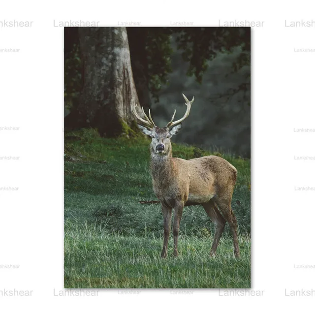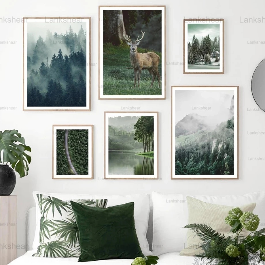 Картина на холсте, настенное искусство, природа, гора, туман, лес, олень, скандинавские плакаты и принты, украшение для гостиной, настенные картины без рамки