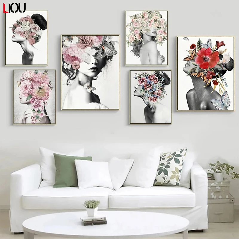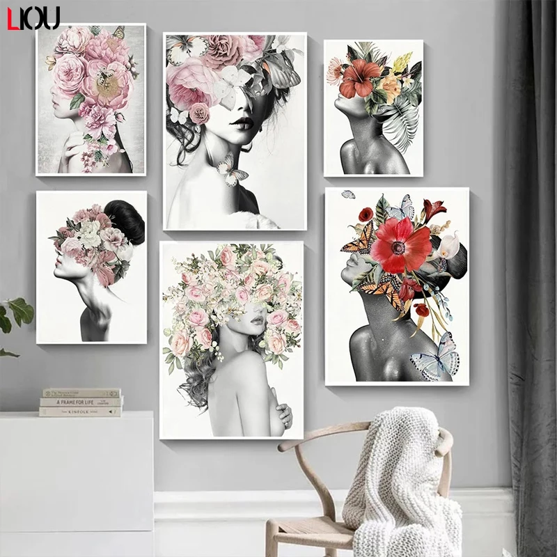 Женское настенное искусство, модное искусство, настенный плакат, цветок, голова и цветок, художественные принты, Бабочка, холст картина для девочек