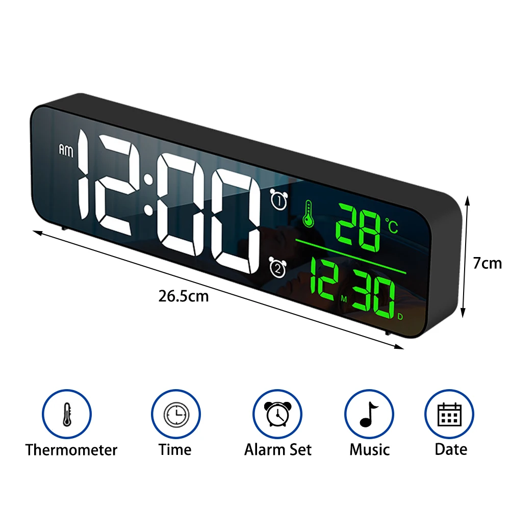 Особенности: Большой светодиодный цифровой дисплей: время, влажность и температура могут быть легко читаются.Функция проекции: время проекта, регулируемый фокус, 3-уровня яркость проекции, можете вращать проекции 180 °.Автоматический светильник-Регулировка: в этом режиме яркость проекции не может автоматически регулироваться в соответствии с яркостью inddor.Функция fm-радио: Ручной FM, время прослушивания может быть установлено, автоматическая станция поиска.Двойная функция будильника: 2 будильника можно установить в любое время отдельно, а также установить режим повтора.Функция внутреннего термометра: Отображение температуры в реальном времени, 12 ч/24 ч режимов.4 уровня яркости дисплея можно регулировать вручную по мере необходимости.Экран отличается особым прогрессом, который может использоваться в качестве зеркала для макияжа.Встроенная функция отключения памяти. Характеристики: Материал: АБС-пластикВход USB: 5 В постоянного токаЦвет корпуса часов: черный/белыйЦвет часов: синий/белый/синий/зеленыйРазмер (около):Стиль A : 183*75 ммСтиль B : 180*95 ммFM частота: 87,5-108 МГцПроекционное расстояние: 0,5-5 мРегулировка громкости: 0-15 уровнейФормат часов: 12 ч/24 чРегулировка яркости: 4 уровняБатареи: 1 * CR2032 (в комплекте) / DC 5 В Посылка включает: Будильник с проекцией времени:-- 1 * проекционные часы-- 1 * CR2032-- 1 * USB кабель-- 1 * Руководство пользователяМузыкальный будильник ( Функция проекции отсутствует ):-- 1 * музыкальные часы-- 1 * USB кабель-- 1 * Руководство пользователяЧасы голосового управления ( Функция проекции отсутствует ):-- 1 * голосовой пульт управления-- 1 * USB кабель-- 1 * Руководство пользователя