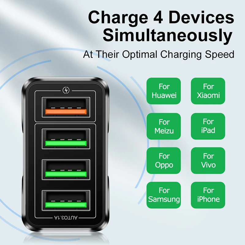 Одновременно заряжайте 4 устройстваОптимальная скорость зарядкиДля Huawei Xiaomi Meizu iPad Oppo Vivo