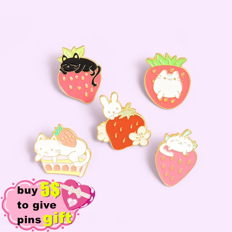 Эмалированная булавка в виде клубничного кота на заказ, значки в виде милого торта, кролика, брошь-кошечка, значки на лацкан с животными, детские подарки, оптовая продажа