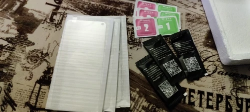 стекло хорошее, но без олеофобного покрытия. нет выреза под фронт камеру - это даже плюс. клеится хорошо. в комплекте жидкость для промазывания краев, она заходит под стекло и убирает весь воздух. наклеил, получилось хорошо