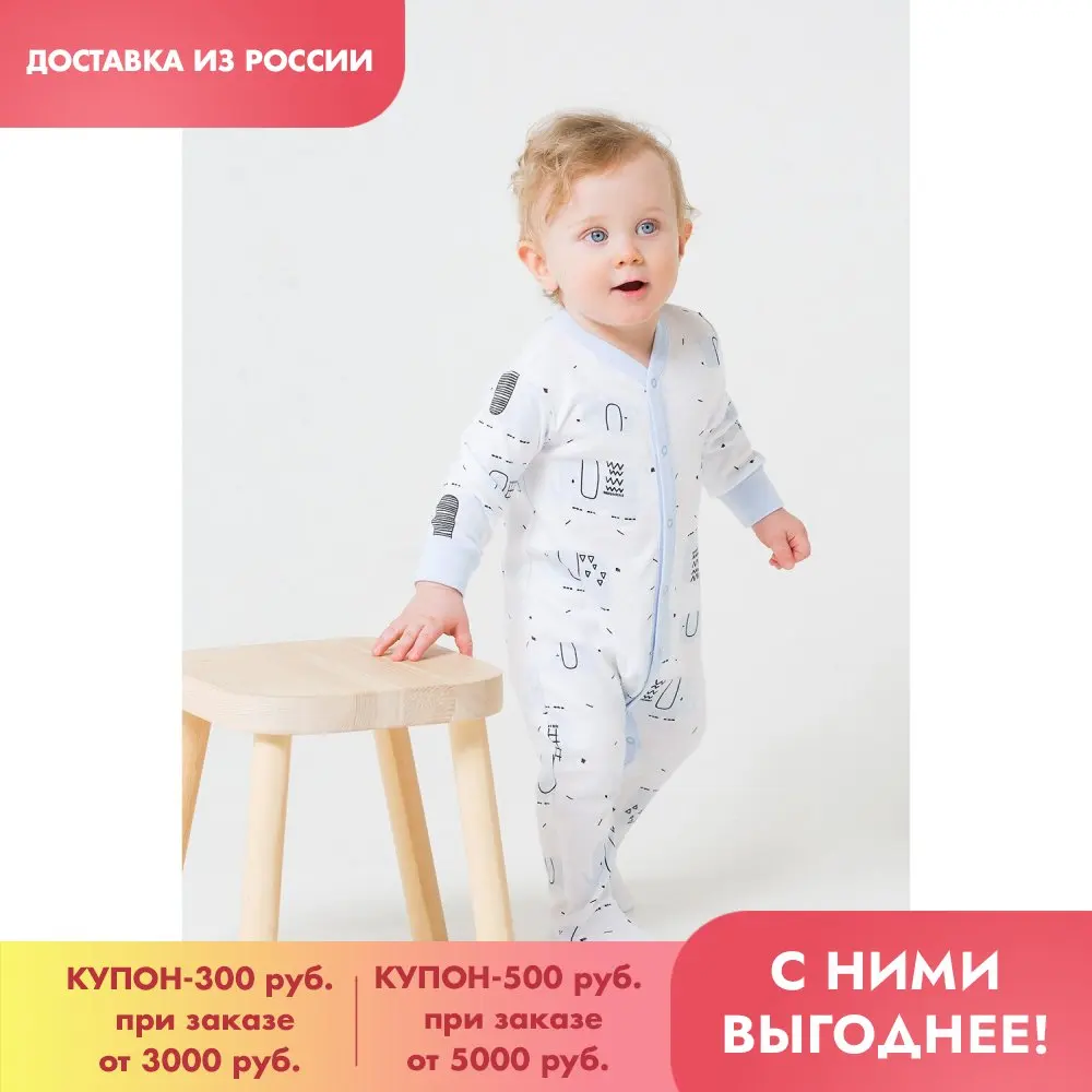 Описание: Комбинезон из хлопкового трикотажа интерлок с набивным рисунком. Длинные рукава. Застёжка на кнопки по центру и шаговым швам.