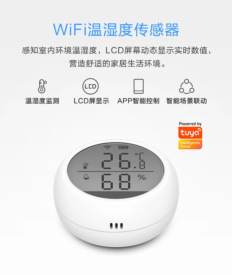 Вес: 70 г (без аккумулятора) Размер: 65 мм * 65 мм * 48 мм Tuya WiFi гигрометр может быть подключен к источнику питания 5V USD, Также может использоваться с двумя аккумуляторами No. 7