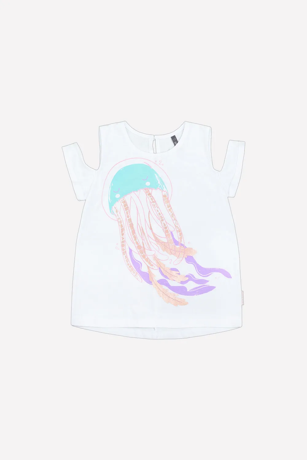 Описание: Футболка для девочки из трикотажного хлопка. На полочке блестящий принт. Короткие рукава с отворотами и вырезами на плечах. На спинке застежка на пуговицу с петелькой. Удлиненный и скругленный низ спинки.