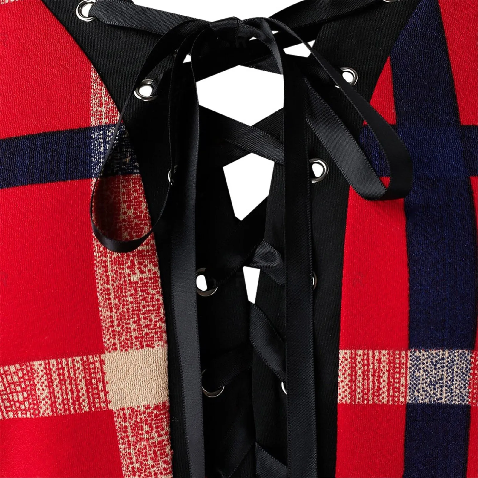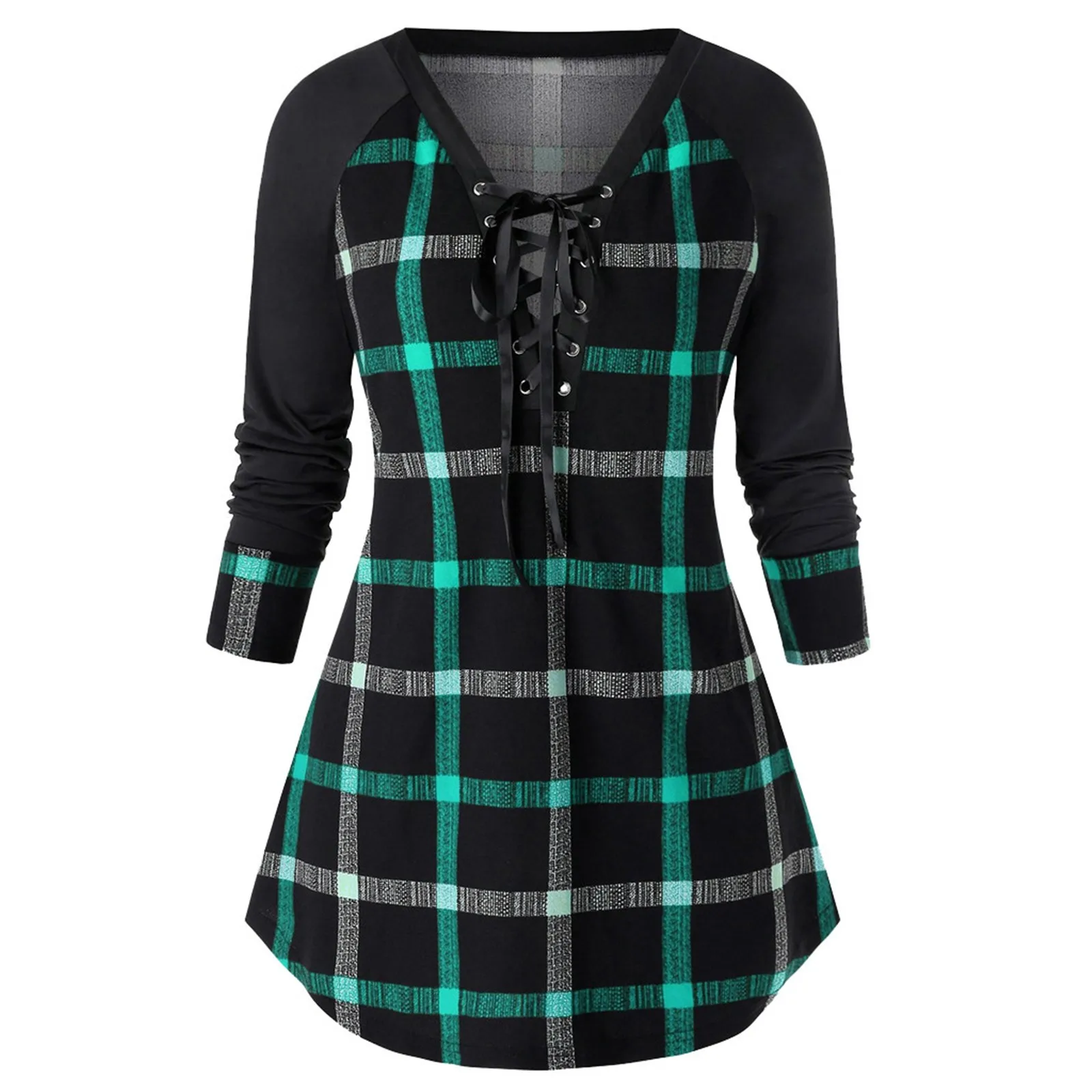 Женская клетчатая туника на шнуровке, с V-образным вырезом и длинным рукавом