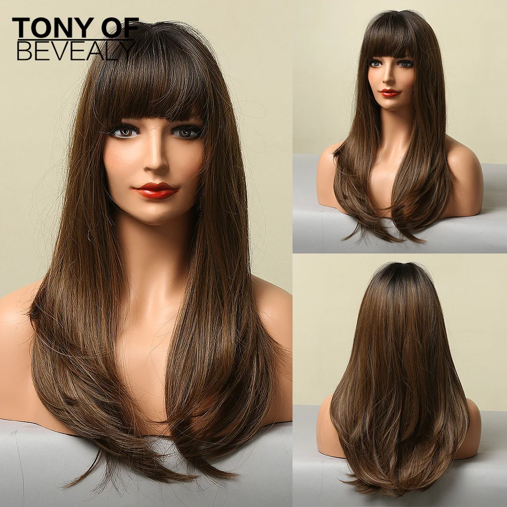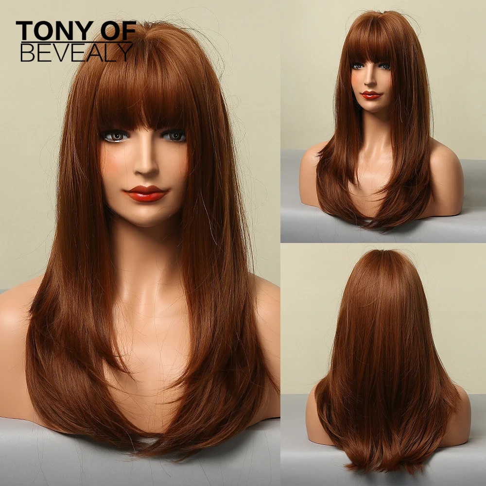 Длинные прямые синтетические парики коричневого и светлого цвета, натуральные парики с челкой для женщин, термостойкие косплей парики на каждый день