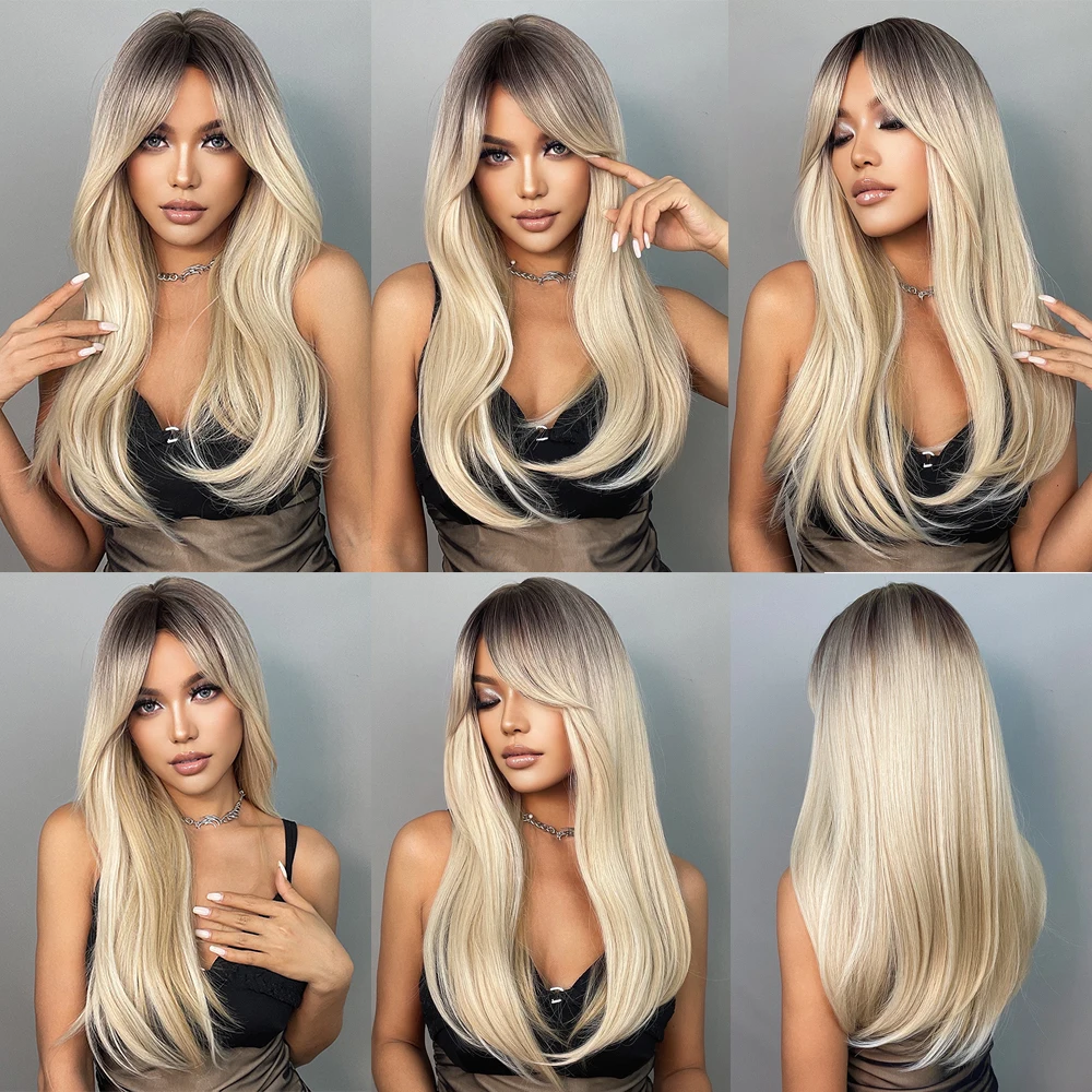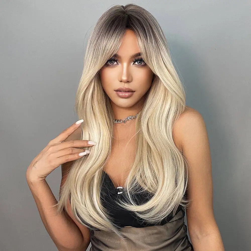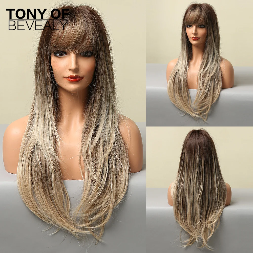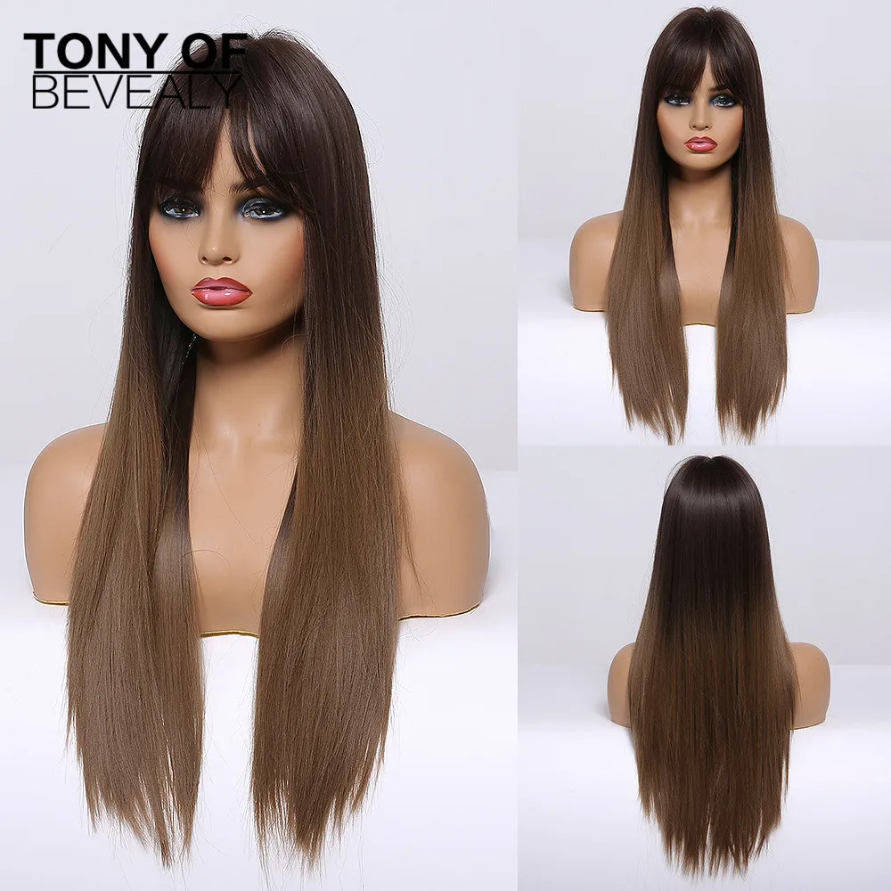 Длинные прямые синтетические парики коричнево-светлые Омбре натуральные парики с челкой для женщин термостойкие косплей парики на каждый день