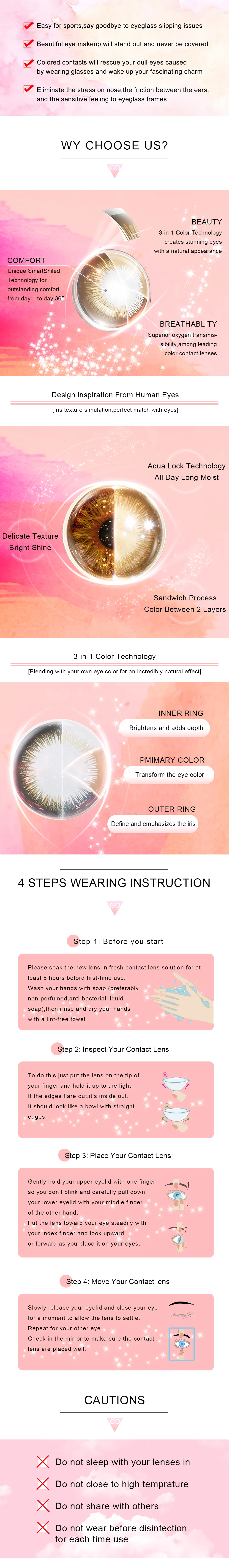 Упаковка:1 пара контактных линз (2 шт.)Состав: гидроксиэтилметакрилат (хема)Эти контактные линзы предназначены для годового использованияСрок годности: 1 годДиаметр: около 14,2 ммОснование кривое: 8,5 мм-8,6 ммЦентр Толщина: 0,12 мм-0,06 ммСодержание воды: 42%Время использования: 12 месяцев (после открытия)Твердость линз: мягкаяСоветы: поскольку у каждого ученика разные цвета, будет небольшая разница в цвете