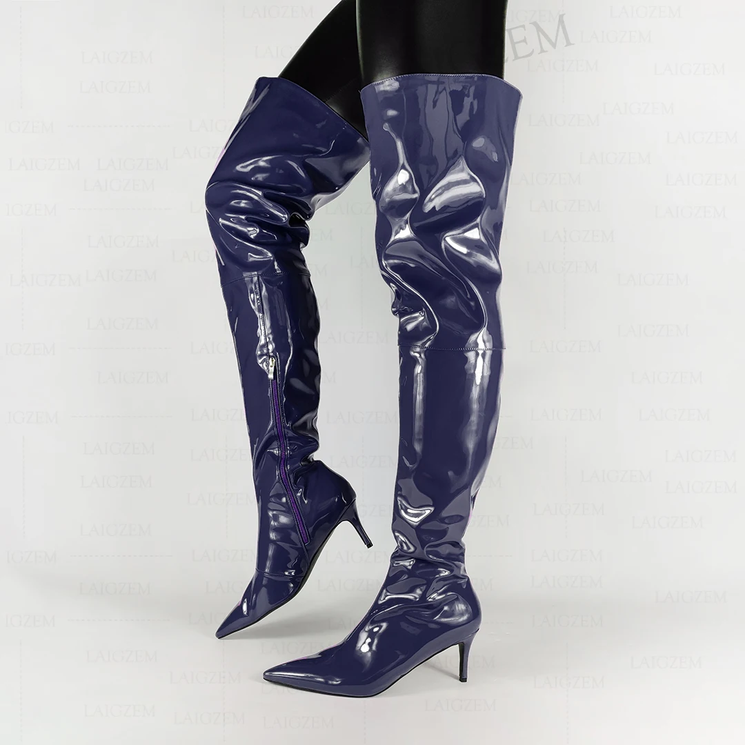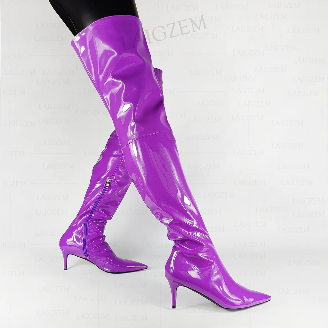 LAIGZEM Женские Сапоги выше колена с молнией сбоку; 7,5 см ботинки на среднем каблуке блестящие сапоги Дамская блестящая женская обувь для девушек, большой Размеры 39 42, 43, 47 (Европа)