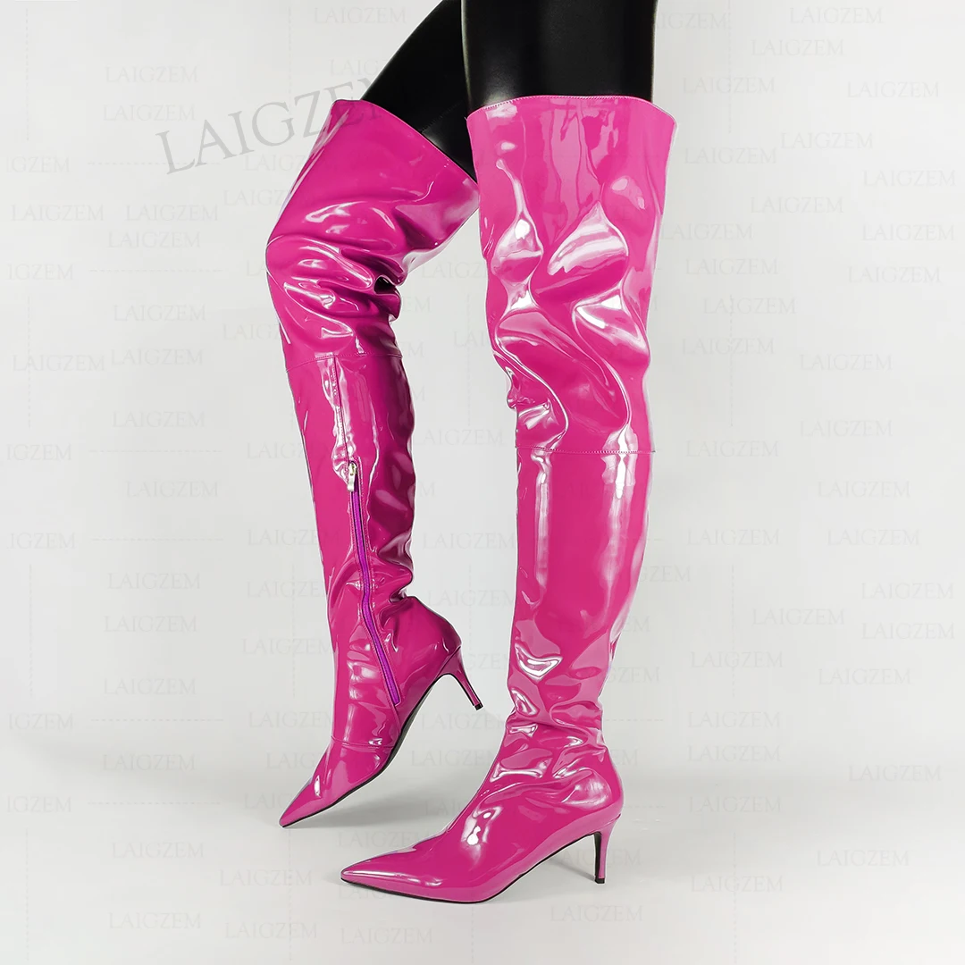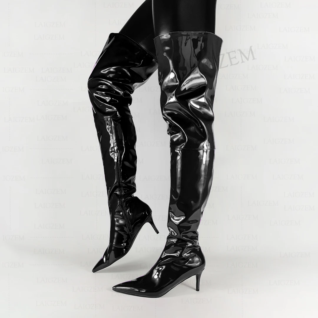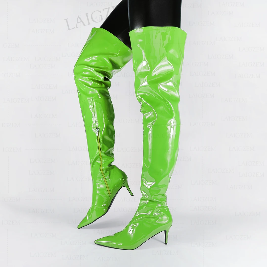 LAIGZEM Женские Сапоги выше колена с острым носком; Блестящая Защит...