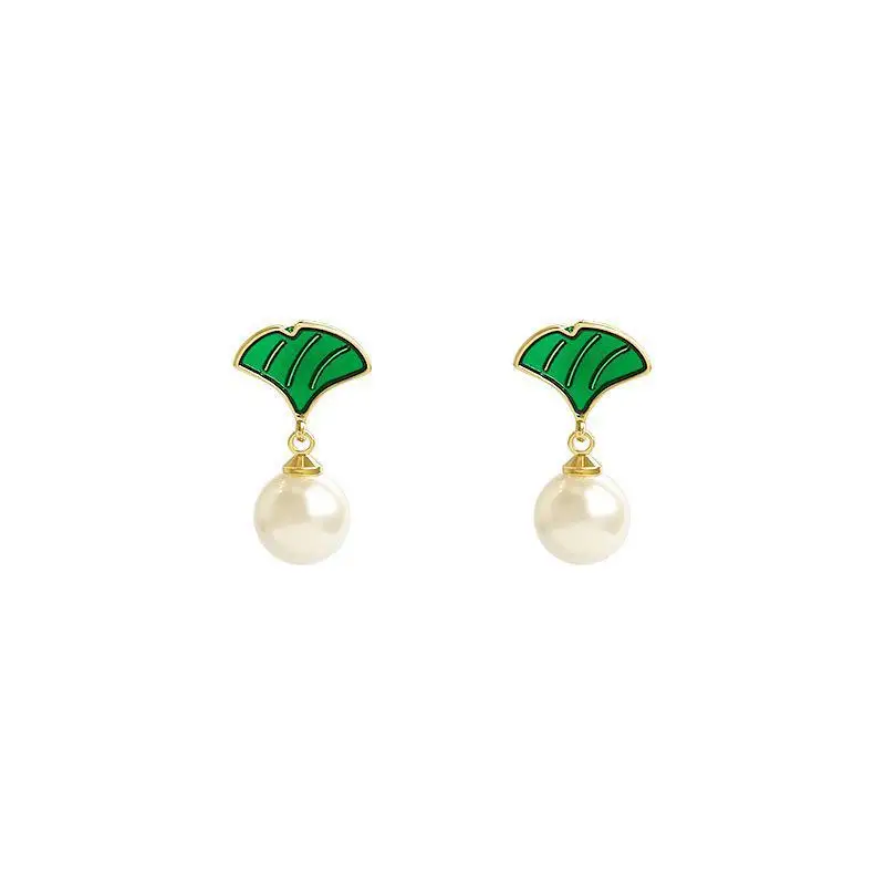 Корейские серьги, Модная бижутерия, гинкго, серьги с искусственным жемчугом и зелеными листьями, элегантные свадебные серьги-гвоздики для женщин, оптовая продажа