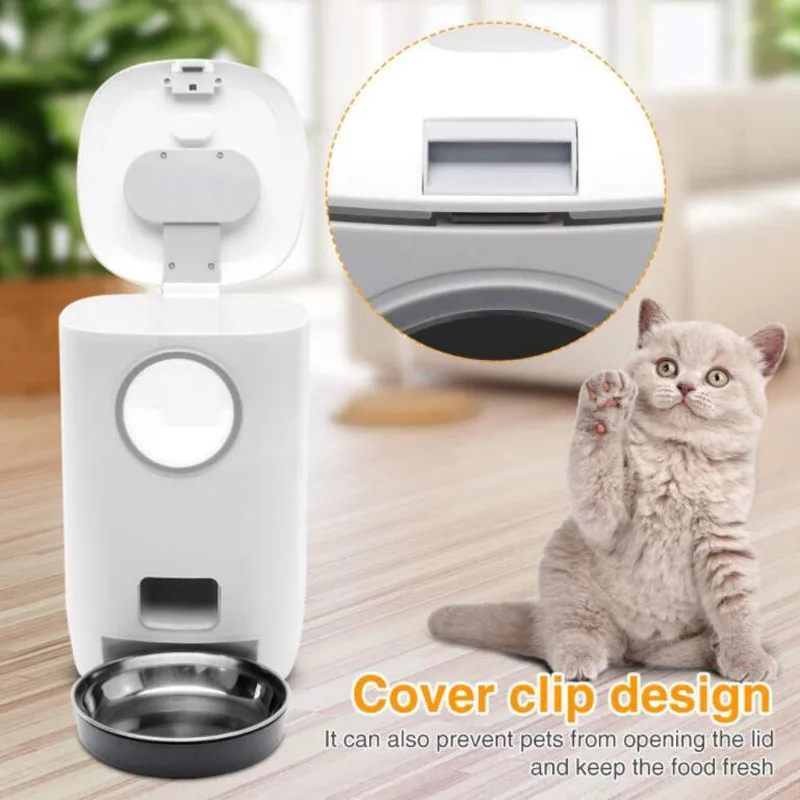 [4,5 литров продуктов емкости] автоматическая кормушка для домашних животных-4,5 литров, подходит для небольших и средних собак домашних животных. Этот питатель для собак может обеспечить вашего питомца едой в течение нескольких дней, чтобы предотвратить голод, особенно когда вы работаете сверхурочно, ночью или в деловых поездках.[Съемный и легко моется] пищевой бак автоматической кормушки для домашних животных является съемным, и лоток для еды из нержавеющей стали съемный для легкой очистки. Специальная конструкция для защиты кнопок проста в установке, а основа устойчива и не скользит для защиты домашних животных. Встроенный инфракрасный датчик может контролировать, Полна ли еда.[Гибкий график подачи] Эта панель кнопки позволяет установить время еды (часы, минуты) и размер еды (размер еды). Этот приуроченный питатель для домашних животных может распределять еду в соответствующее время, 1-4-разовое питание в день (завтрак, обед, ужин, 4-я еда), каждое питание до 20 порций (до 100 граммов).[Рекордер] вы можете нажать и записать свой голос, чтобы напомнить вашему питомцу, что нужно есть. Это голосовое сообщение занимает 10 секунд. Умный питатель для домашних животных будет автоматически играть 3 раза перед каждым приемом пищи, чтобы напомнить им регулярно питаться, оставаться здоровым и чувствовать себя расслабленным, когда вы не дома.[Двойной режим питания и безопасность] Этот питатель питания для домашних животных имеет двойную мощность, режим батареи (требуется батарея 3D размера) и режим питания адаптера переменного тока. Чехол полностью заряжен, режим работы батареи гарантирует своевременное питание вашего питомца. Кроме того, этот автоматический питатель для домашних животных не может быть помещен на открытом воздухе или подвержен воздействию дождя. Держите его сухим, чтобы предотвратить попадание воды в питатель.