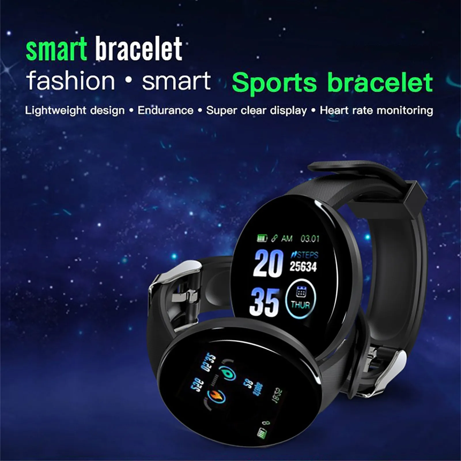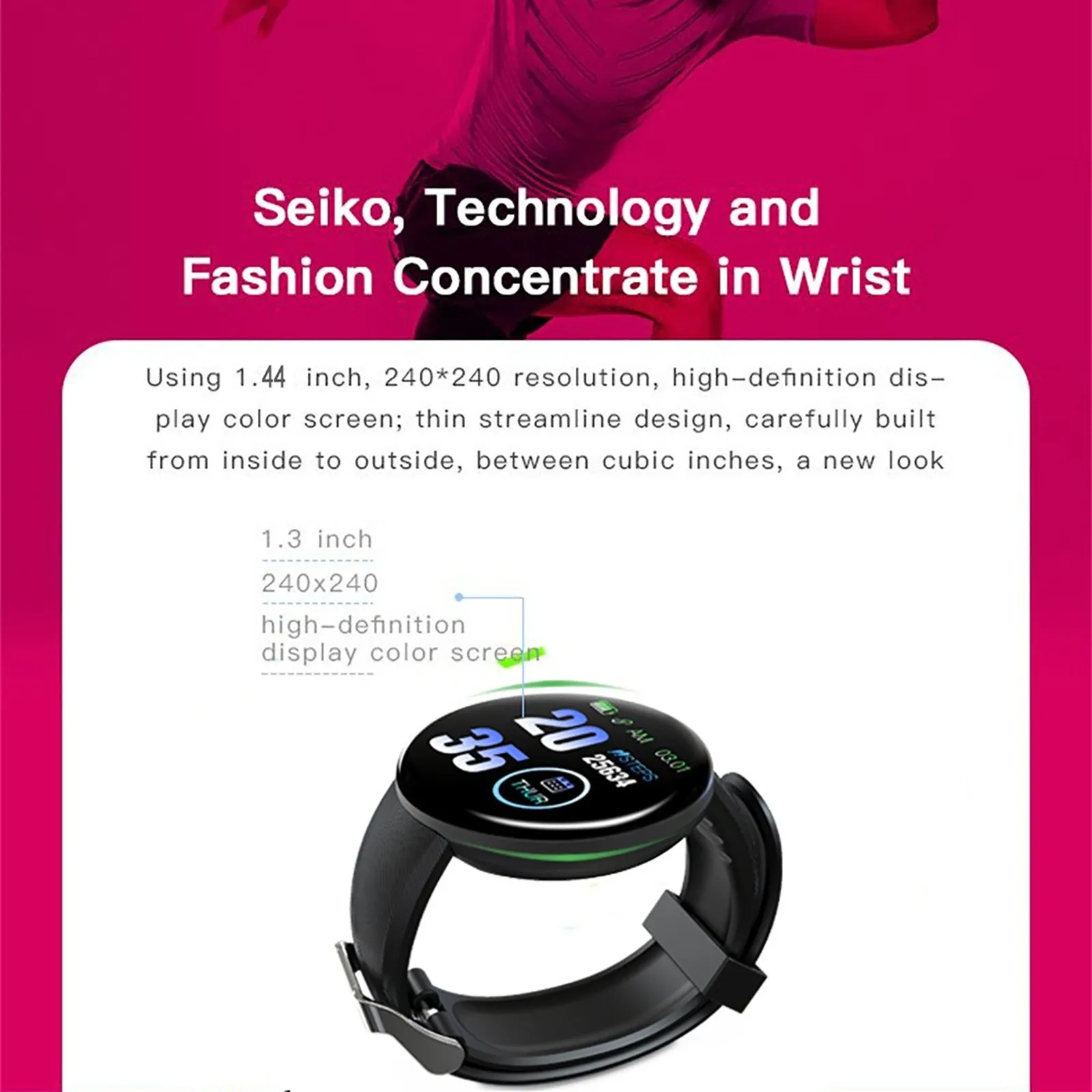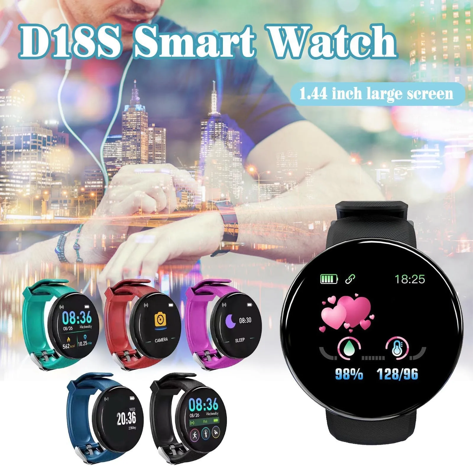 Особенности: 1.1.44 дюймовый TFT цветной экран с высокой чувствительностью и однимПрессКонтроль, Которые могут осуществлять различные операции. 2. Поддержка уведомления о звонках и сообщениях, важная информация не будет Пропущен. 3.IP65 водонепроницаемый для повседневной жизни, мульти-спортивный режим, подходит для занятий спортом на открытом воздухе. Автоматически записывает ежедневный шаг движения и данные о калориях. 4. Поддержка мониторинга сна Функция, когда вы засыпаете, она автоматически контролирует качество Режим сна и запись данных в приложении. 5. Usb-разъем для зарядки, снимите ремешок для подключения и зарядки, Легко и удобно. Спецификация: Модель: D18S Тип: умные часы Материал: АБС-пластик и Резина Размер экрана: 1,44 дюйма TFT Коэффициент разрешения: 240x240 Версия BT: BT 4,0 Совместимость ОС: Android 5,0 и выше/IOS9.0 и выше Режим работы:ПрессКнопка Емкость аккумулятора: 90 мАч Функции: Настройка будильника, напоминание о сидячем положении, шагомер, монитор сна, Напоминание о звонках/сообщениях, Поиск телефона, поднятие руки на светильник, удаленная камера И многое другое. Тип оповещения: вибрация Язык приложения: китайский, английский, испанский, французский, немецкий, русский, арабский, голландский, Португальский, арабский, турецкий, японский, Малайзийский, тайский Посылка: 1 * умные часы 1 * ремешок для часов