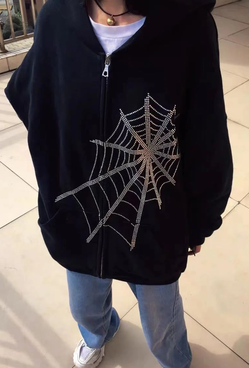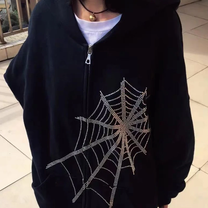 Толстовки в стиле Харадзюку, женская черная верхняя одежда на молнии, готические панковские толстовки в стиле паука, повседневные женские худи с капюшоном в стиле гранж и темных мужчин