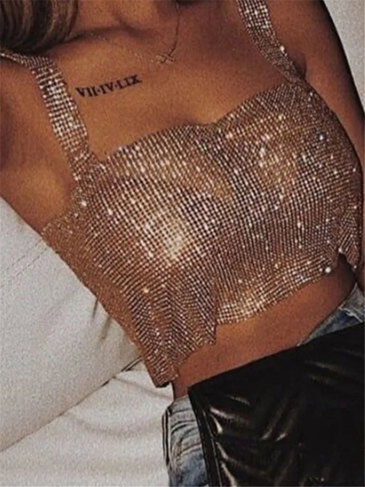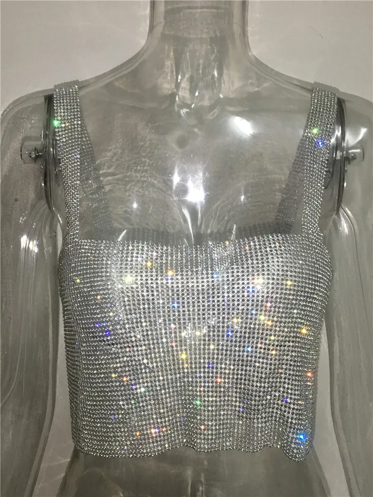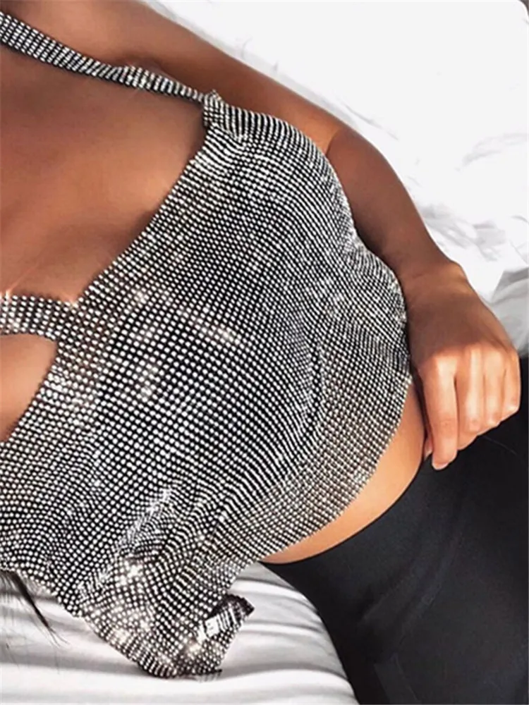 Женский жилет Стразы с лямкой на шее, Женский Топ без рукавов с маленькими бретельками и блестящим бриллиантом, сексуальная одежда для ночного клуба с открытым пупком