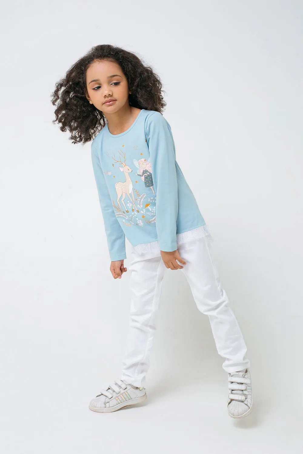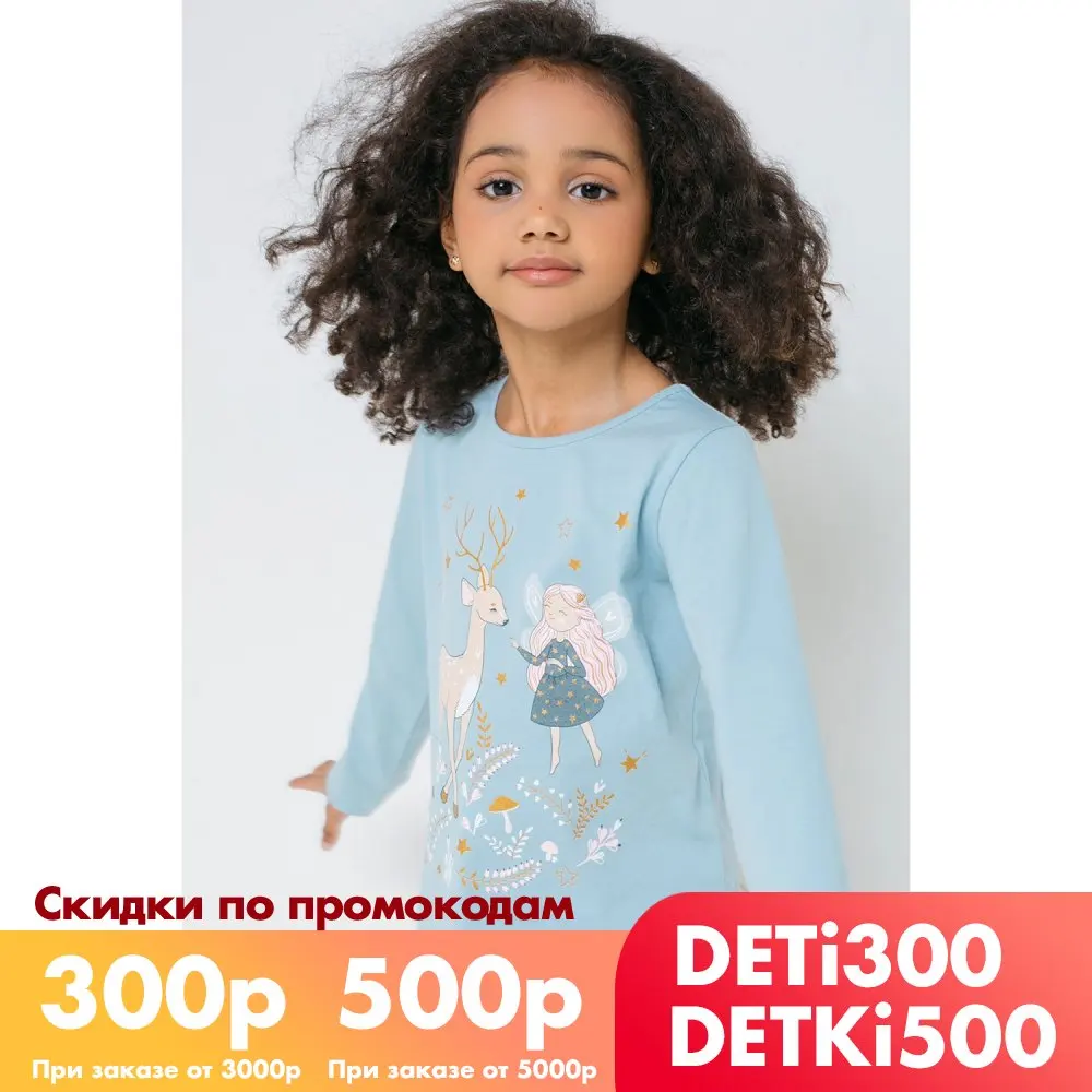 Описание: Джемпер для девочки с длинными рукавами. Украшен принтом на груди и оборкой из сетки. Спинка удлинена. До 98 размера для удобства при одевании застёгивается на спинке с помощью кнопок.
