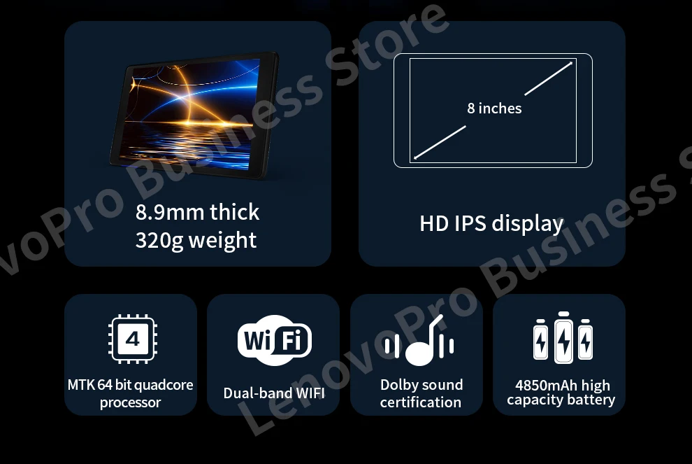 Размер/вес: 209x123x8.9 мм/320 гСеть: Wi-FiПлатформа: MTK MT8163B 4 core1.3GHzОС: Android NЭкран: 8,0 ”,1280x800 HD IPSКамера: Передняя 2 МП FF, задняя 5 Мп AFЭксплуатация/хранение: 2G + 16GBWLAN: 802,11 a/b/g/n Bluetooth4.2 / GPsИнтерфейс: Micro USB/3,5 мм аудио Интер-лицевая сторона/; Слот для карт памяти micro SDЗвук: 1 громкоговоритель, Dolbypanoramic soundДатчик: Датчик ГравитацииАккумулятор: 4850 мАч* Характеристики могут отличаться в зависимости от региона