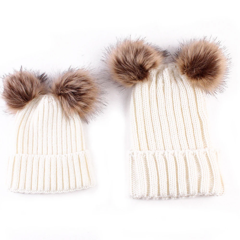 Шапка с двумя меховыми помпонами мама и я, милая детская зимняя шап...