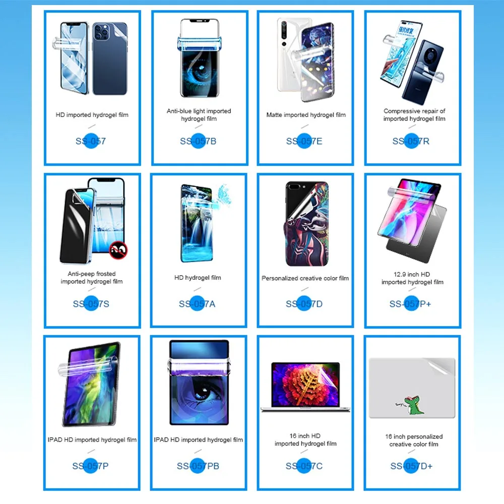 Все гидравлические пленки являются 100% оригинальным заводским производством, все пленки имеютКоды резки, Пожалуйста, будьте уверены в использовании50 бесплатных 55 разрезов20 бесплатных 20 разрезовSS-057A, гидравлическая пленка, 50 шт, 12 смх18 смSS-057, HD Гидрогелевая пленка, 50 штук, 12 смх18 смSS-057B, анти-синий светильник, гибкая Гидрогелевая пленка, 50 шт, 12 смх18 смSS-057D, цветная пленка для задней панели, случайный цвет, 50 шт., 12 см x 18 смSS-057E, матовая гидравлическая пленка, 50 шт, 12 смх18 смSS-057R, изогнутая экранная устойчивая к давлению ремонтная гидравлическая пленка, 50 шт, 12 смх18 смSS-057P, планшет/IPAD Гидрогелевая пленка, 20 шт, 20 смх30 смSS-057PB, планшет/IPAD Анти-синий светильник Гидрогелевая пленка, 20 шт, 20cmX30cmSS-057P плюс, большой 12,9 дюймов для IPAD гидрогель пленка, 20 шт., 23cmX33cmSS-057S, конфиденциальность, Гидрогелевая пленка, 50 шт., 12 см x 18 см (не подходит для отпечатков пальцев под экраном)